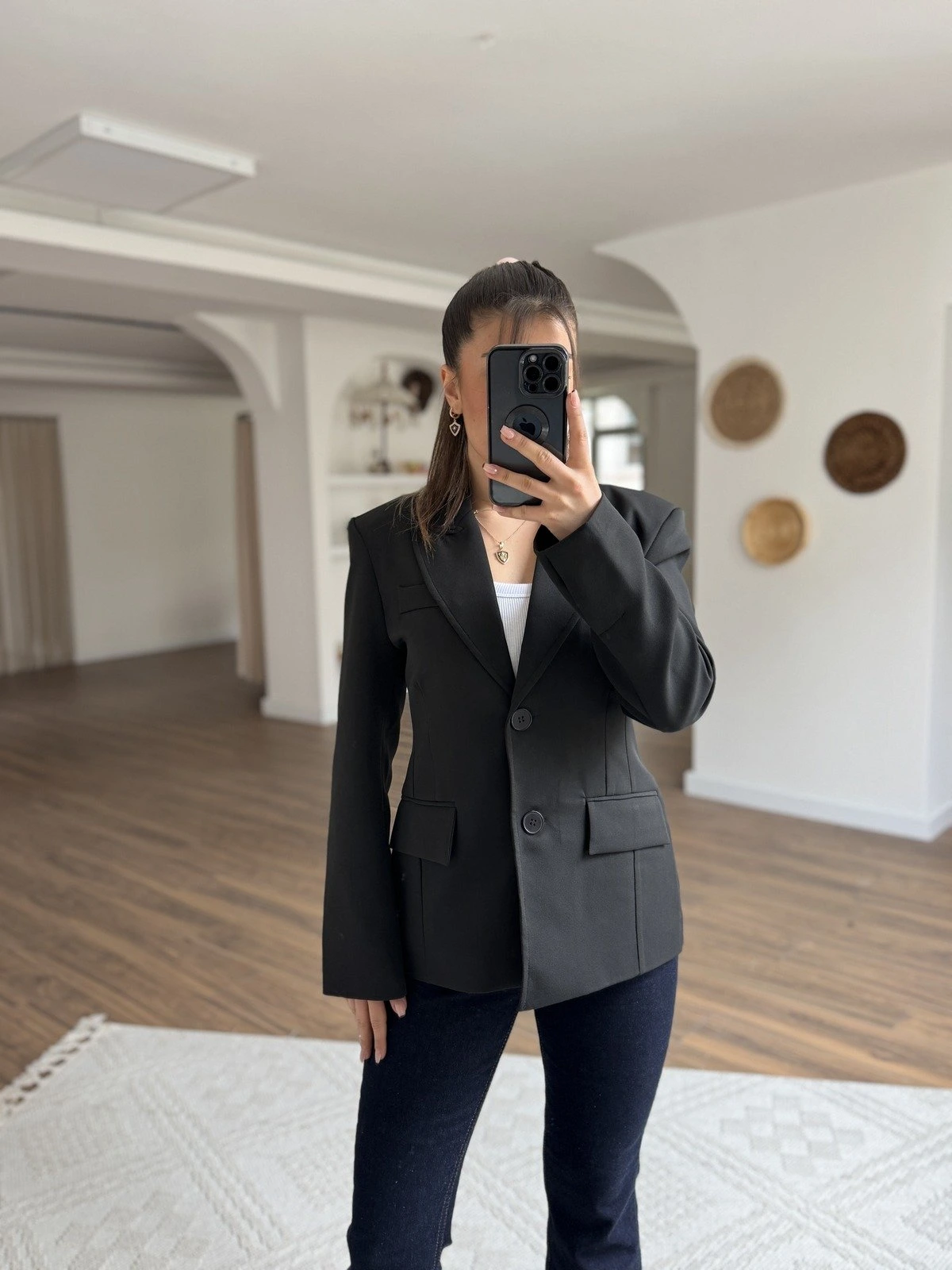 BELDEN OTURMA KAPAK CEP ÇİFT DÜĞME CEKET – SİYAH