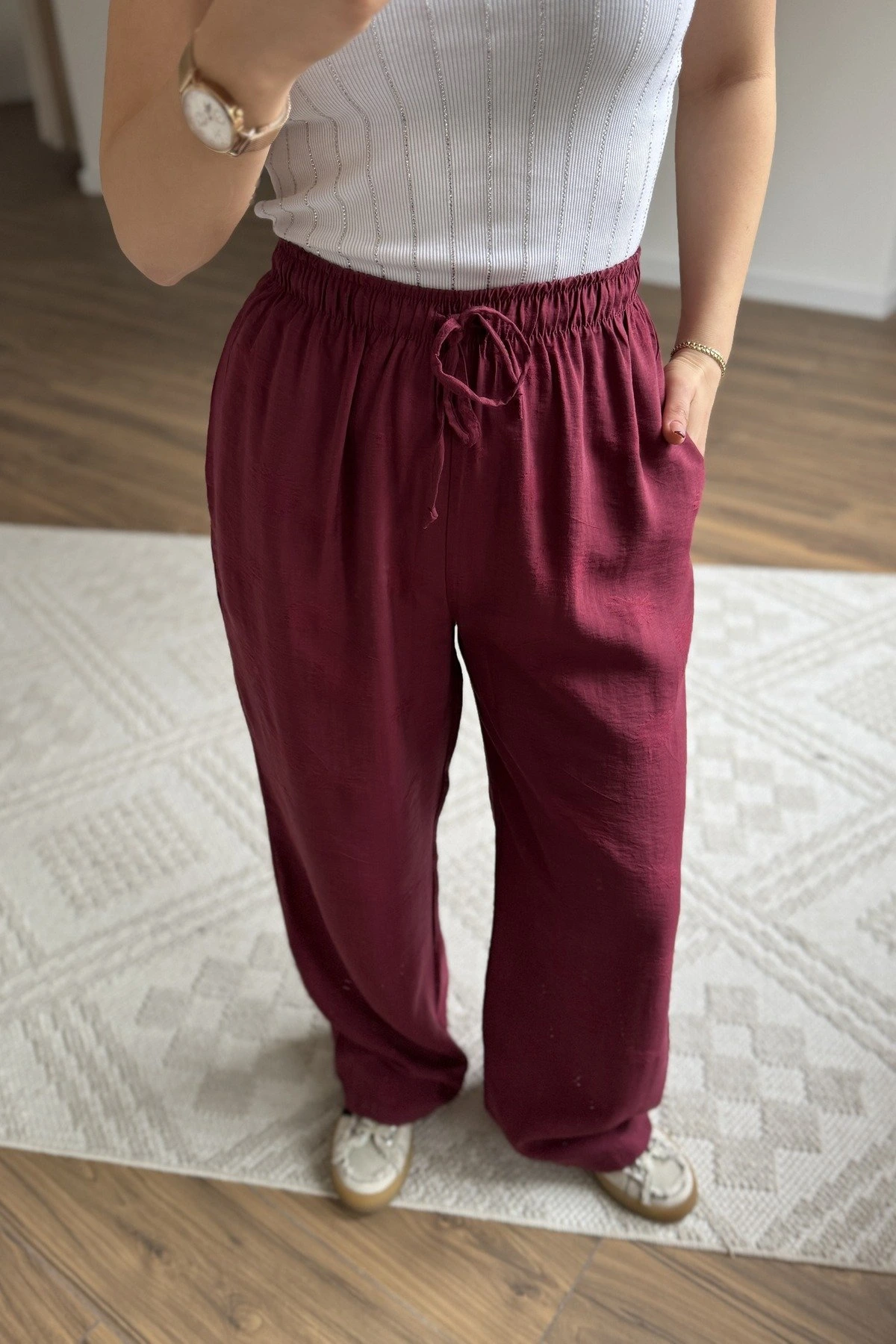 CEPLİ ÇİÇEK DOKU DESEN VİSKON TENSEL PANTOLON – BORDO