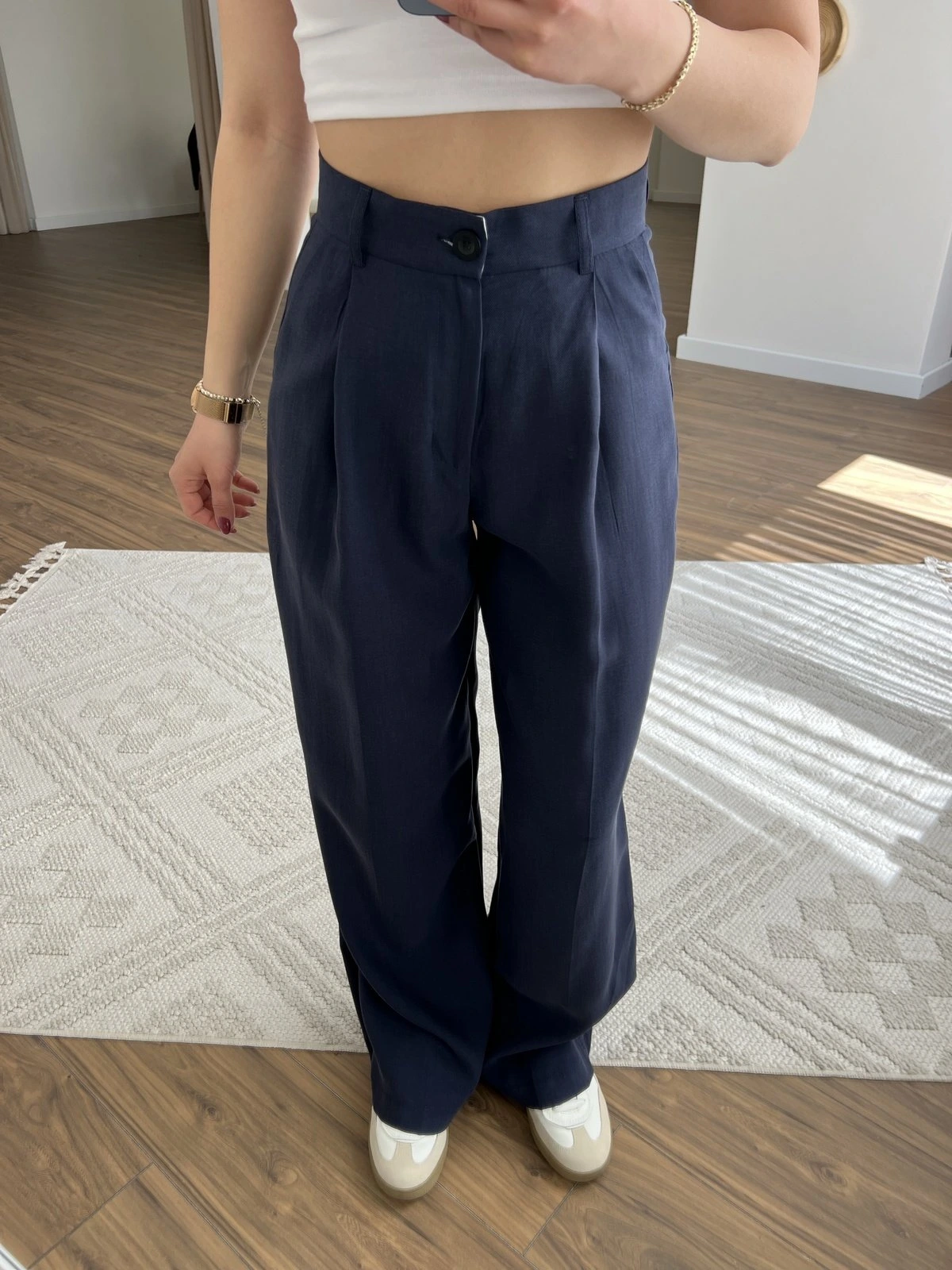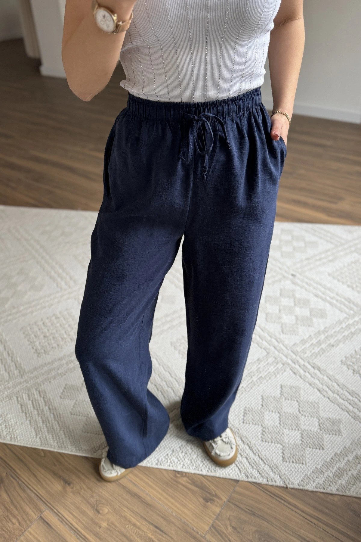 ARKA BEL LASTİK BOL PAÇA KETEN VİSKON PANTOLON – LACİVERT