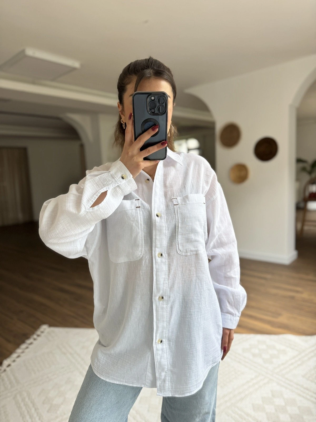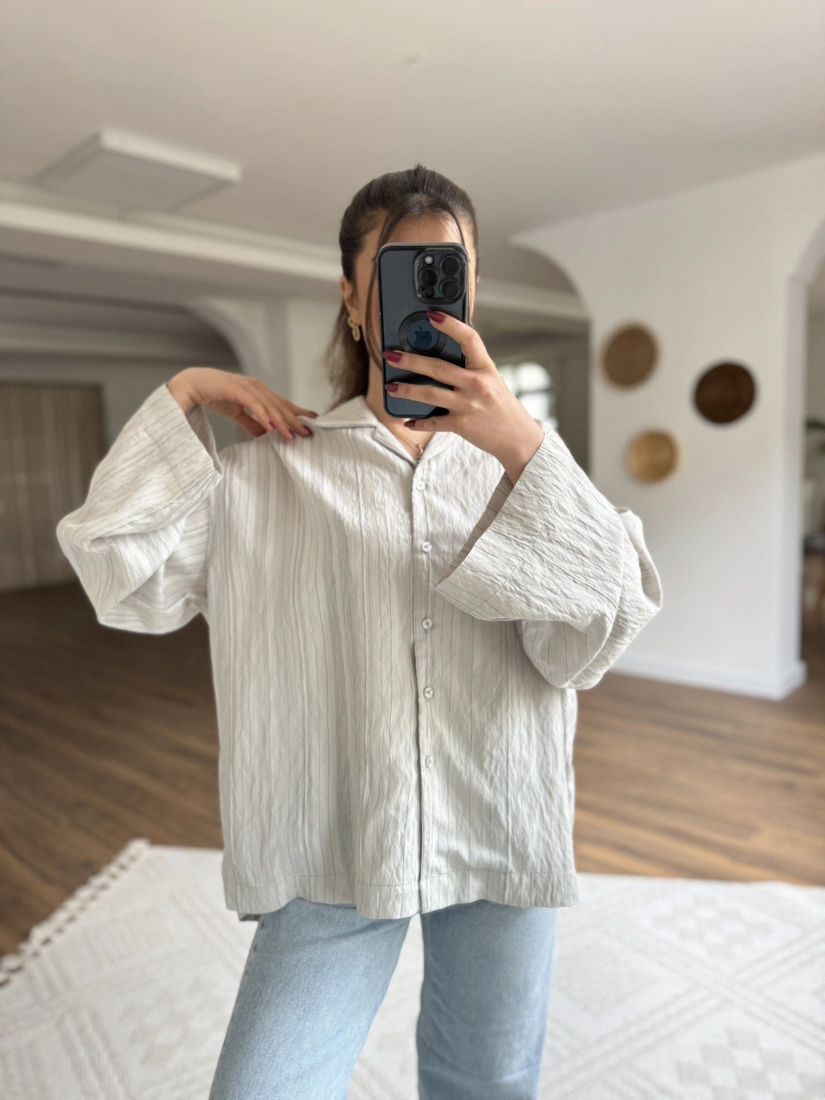 DOKU ÇİZGİ SALAŞ PAMUK KETEN GÖMLEK – BEYAZ