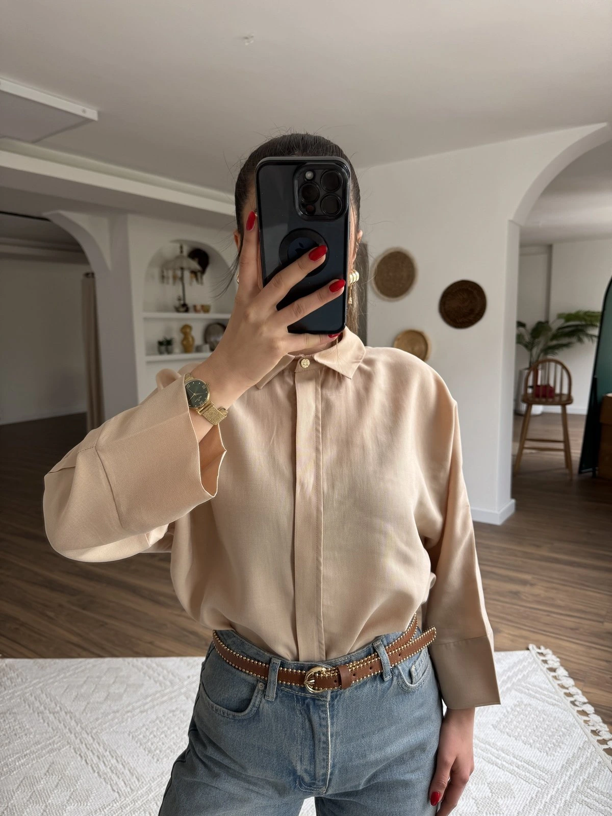 GİZLİ DÜĞME TRUVAKAR KOL PAMUK KETEN GÖMLEK – BEJ