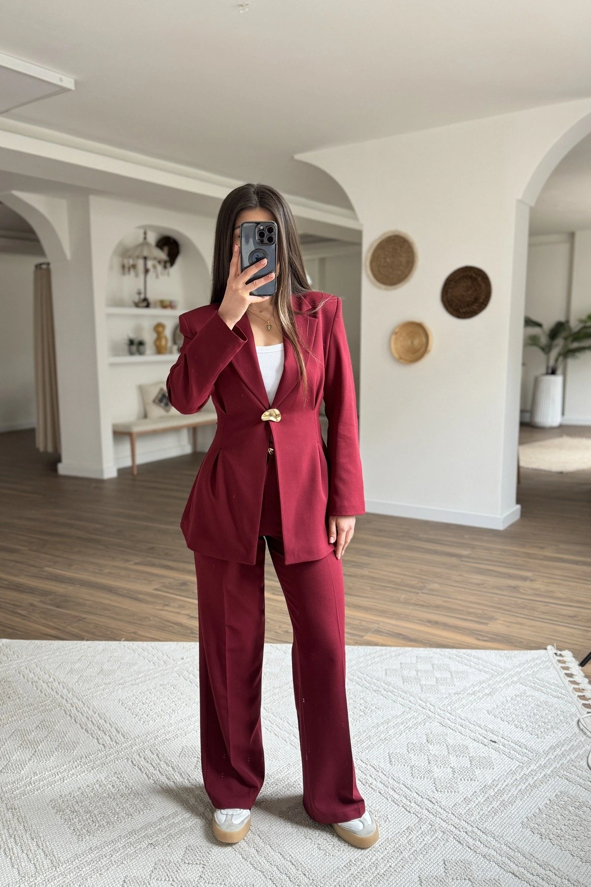 GOLD DÜĞME PİLE DETAY CEKET BOL PAÇA PANTOLON TAKIM – BORDO