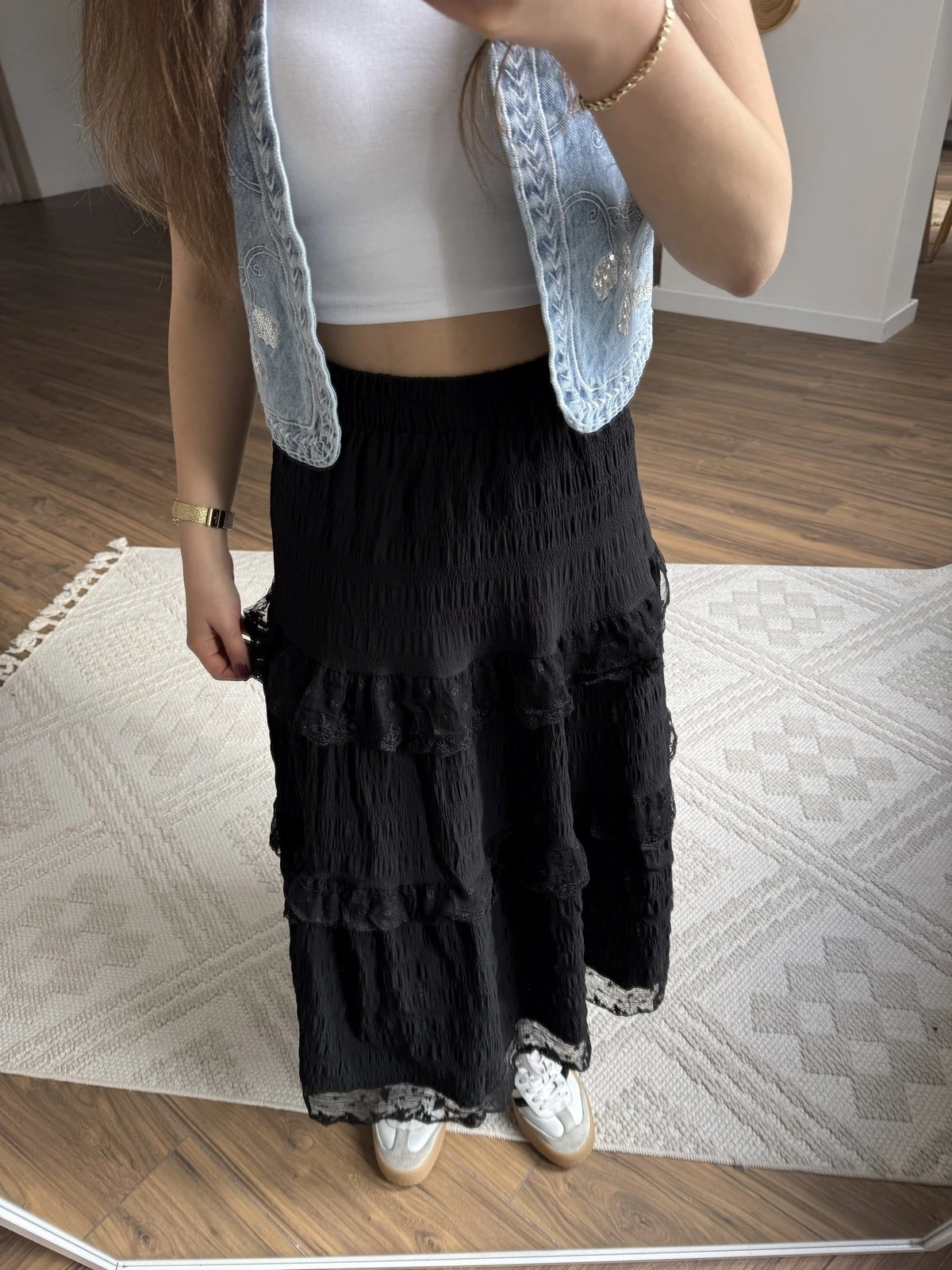 GÜPÜR KAT DOKU KUMAŞ ASTARLI MİDİ ETEK – SİYAH