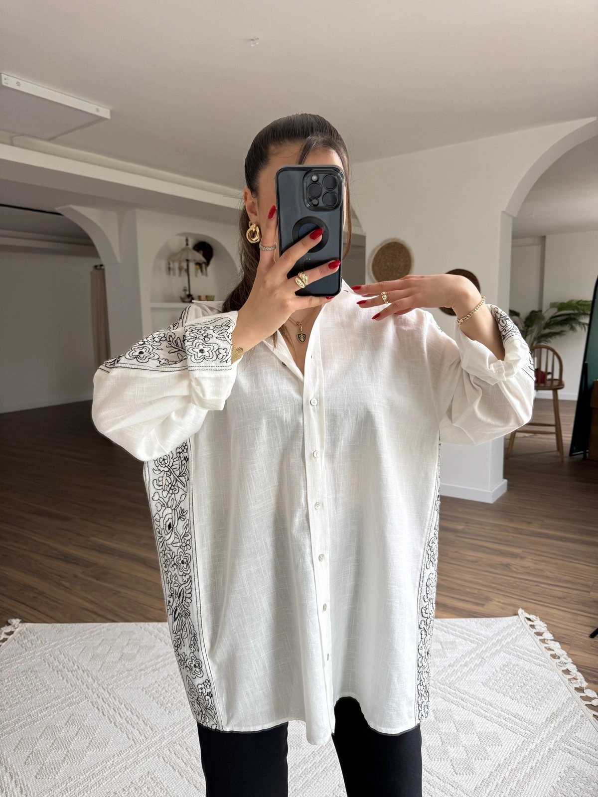 KOL VE YAN ÇİÇEK KUŞ NAKIŞ PAMUK SALAŞ GÖMLEK – EKRU