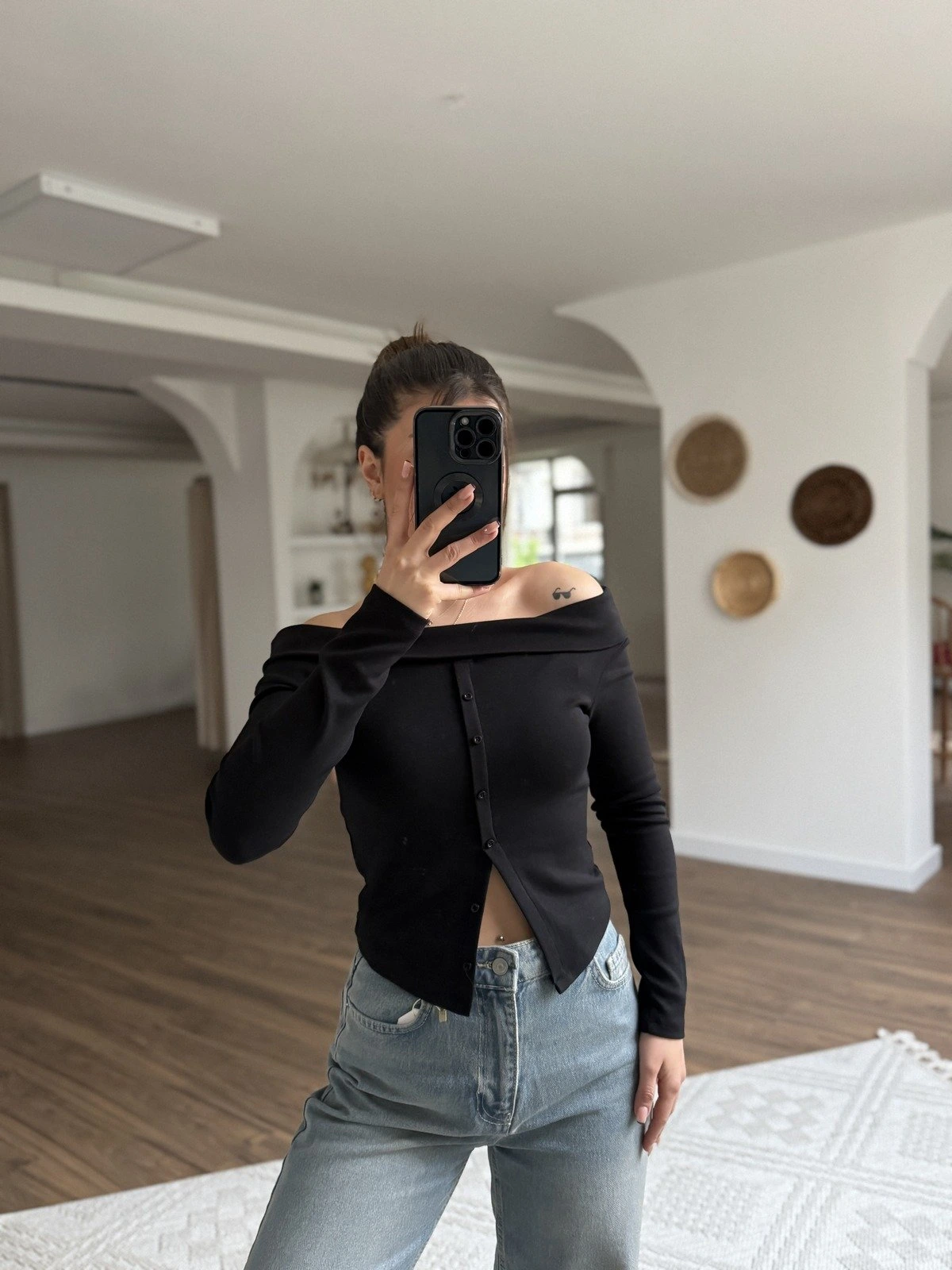 MADONNA YAKA DÜĞMELİ PAMUK BLUZ – SİYAH