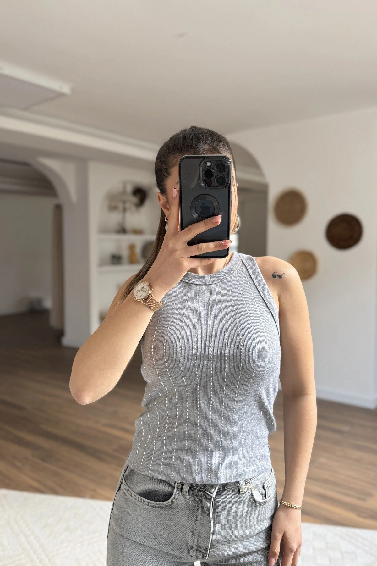 ÖN ŞERİT SIRA TAŞ BASKI PAMUK HALTER YAKA ATLET – GRİ