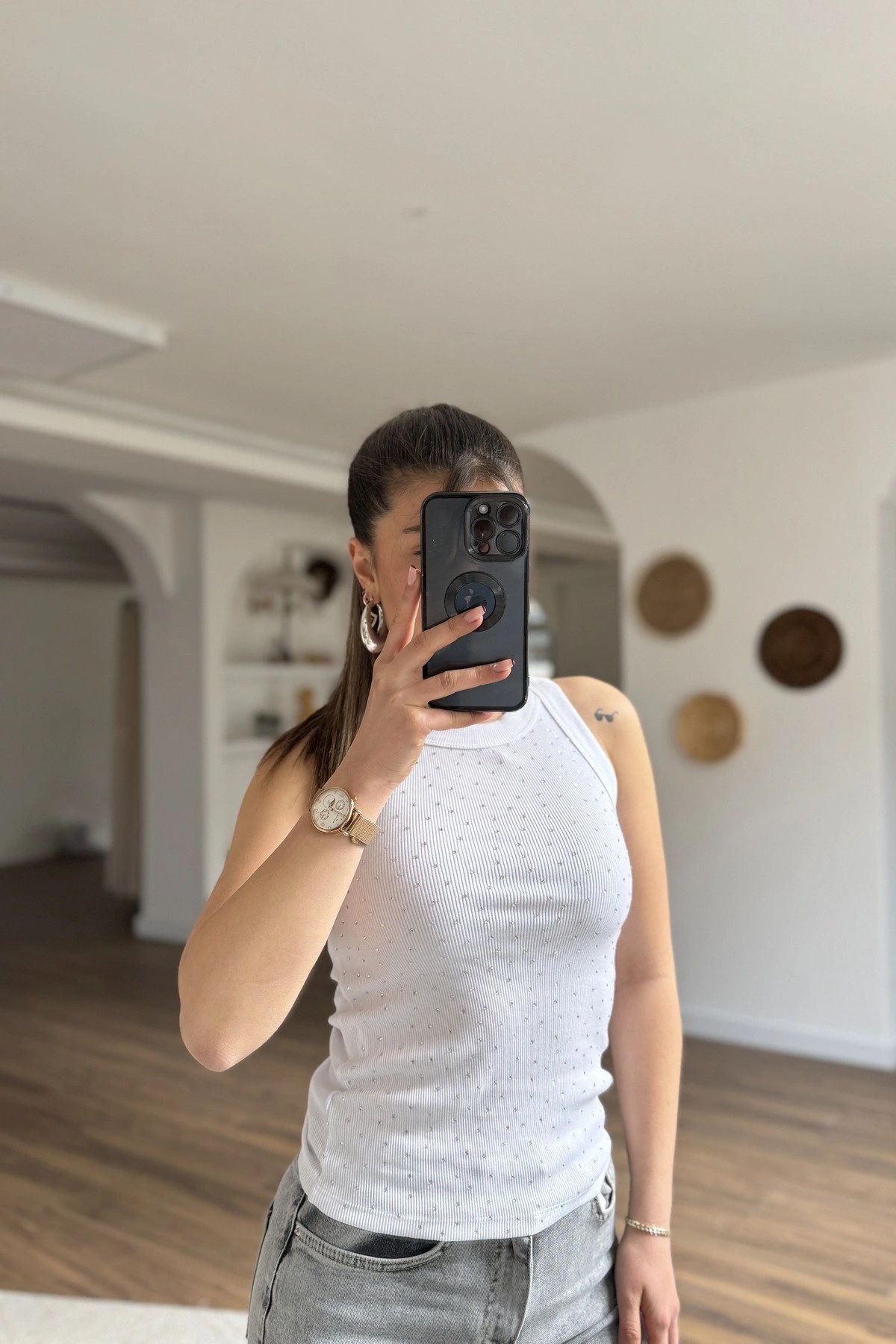 ÖN ŞERİT SIRA TAŞ BASKI PAMUK HALTER YAKA ATLET – BEYAZ