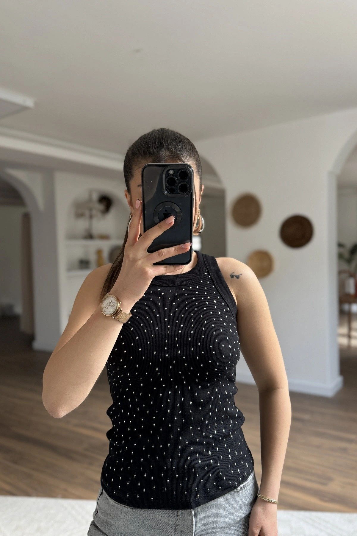 ÖN ŞERİT SIRA TAŞ BASKI PAMUK HALTER YAKA ATLET – SİYAH