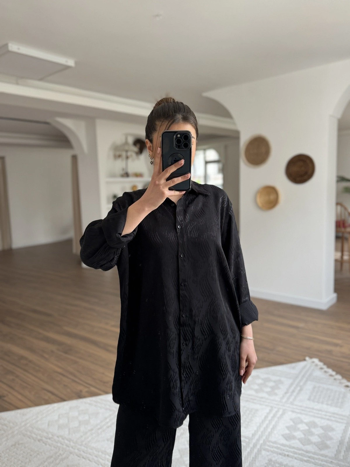 34420 PARLAK DOKU DESEN UZUN İPEK VİSKON GÖMLEK – SİYAH
