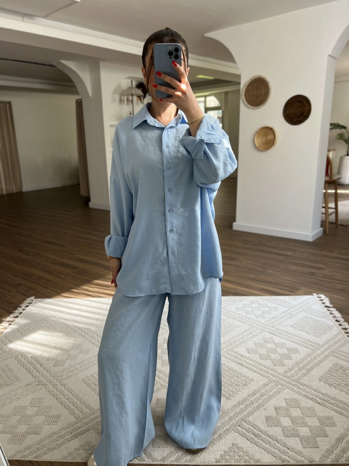 TAŞ BASKI SALAŞ GÖMLEK PANTOLON PAMUK TAKIM – MAVİ