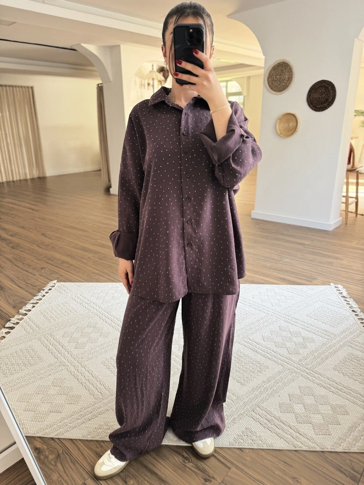 TAŞ BASKI SALAŞ GÖMLEK PANTOLON PAMUK TAKIM – MÜRDÜM