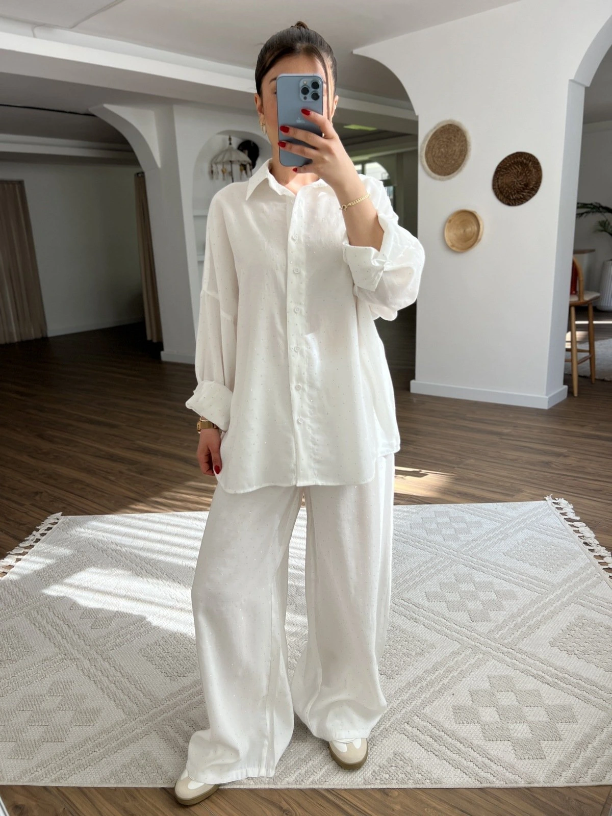 TAŞ BASKI SALAŞ GÖMLEK PANTOLON PAMUK TAKIM – EKRU