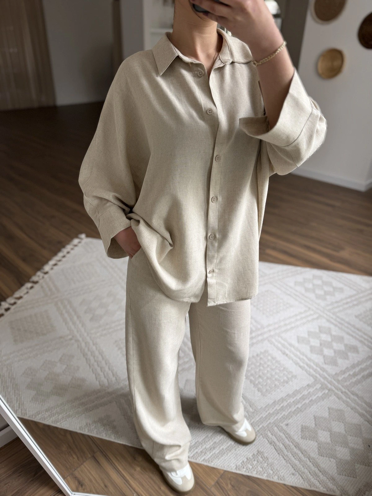 YIRTMAÇ KOL SALAŞ GÖMLEK PANTOLON VİSKON PAMUK TAKIM – NATUREL
