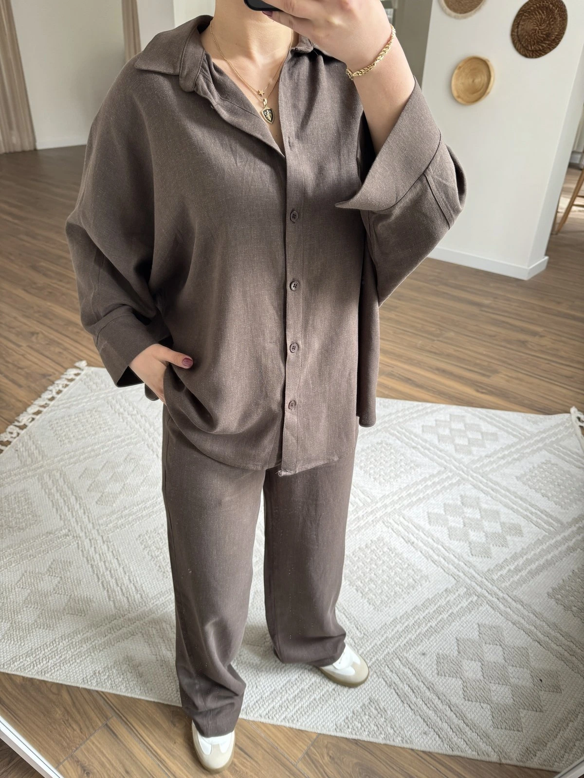 YIRTMAÇ KOL SALAŞ GÖMLEK PANTOLON VİSKON PAMUK TAKIM – KAHVE