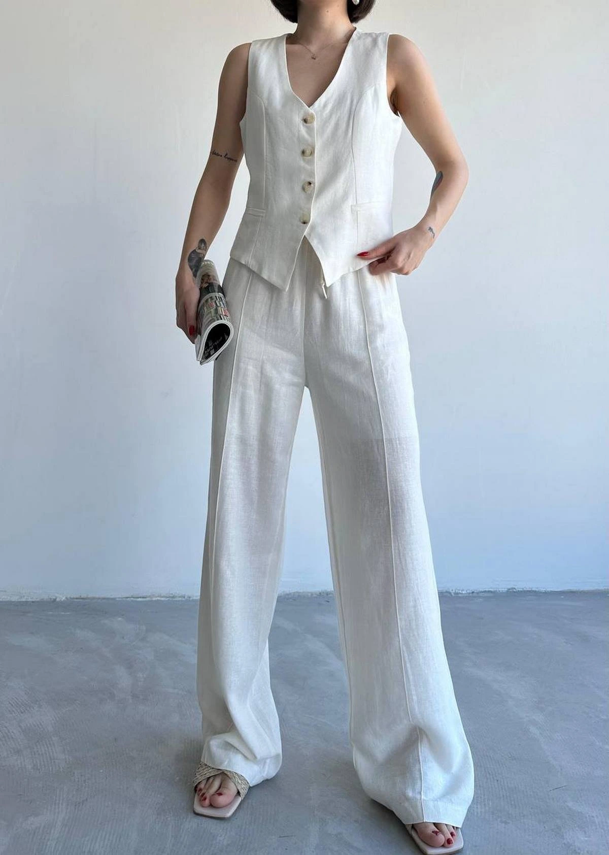 KARE YAKA ASTARLI YELEK PANTOLON PAMUK TAKIM – EKRU