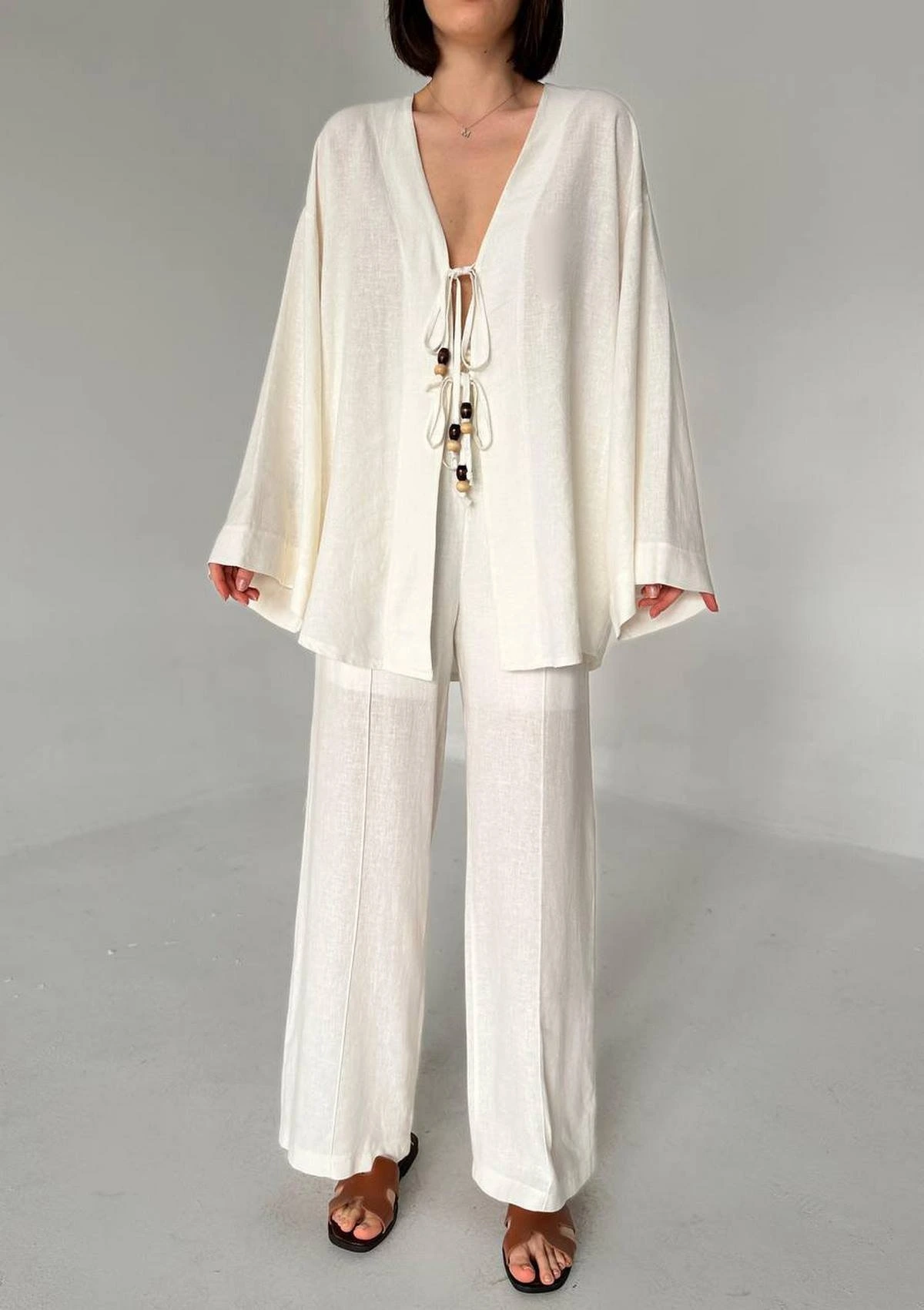 BAĞCIKLI KİMONO ASTARLI PANTOLON PAMUK TAKIM – EKRU