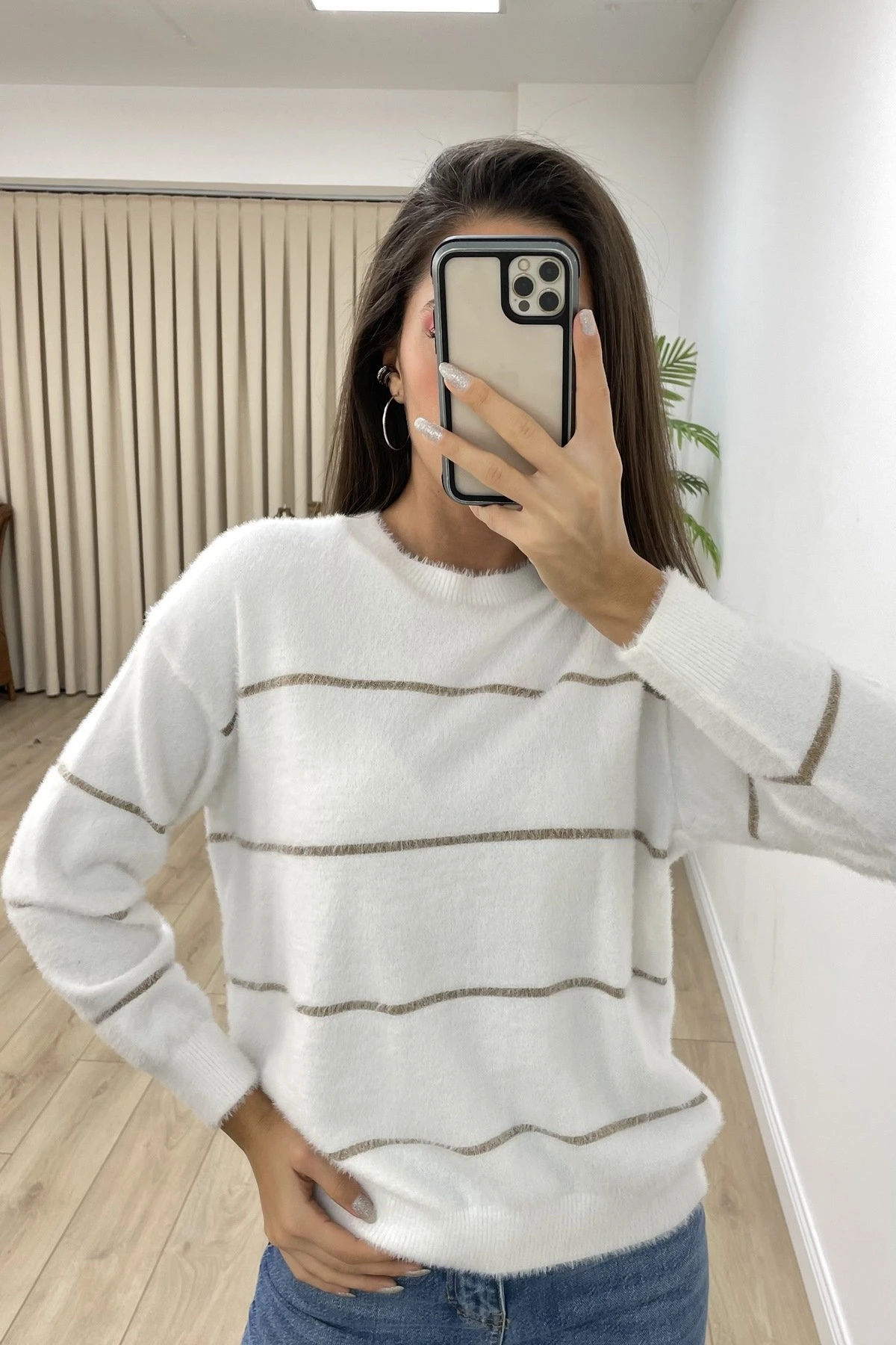 ÇİZGİLİ CEPLİ TİRİL PALAZZO PANTOLON – EKRU
