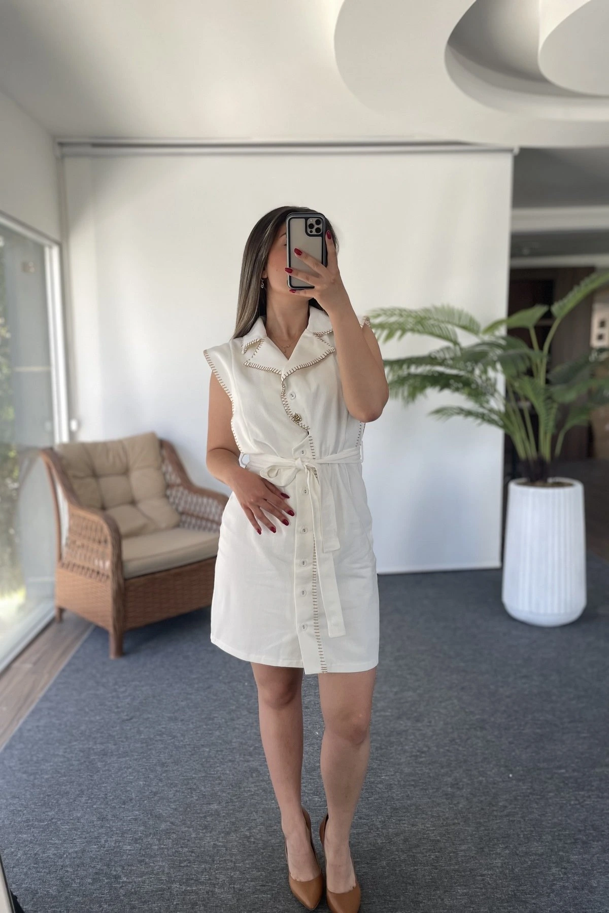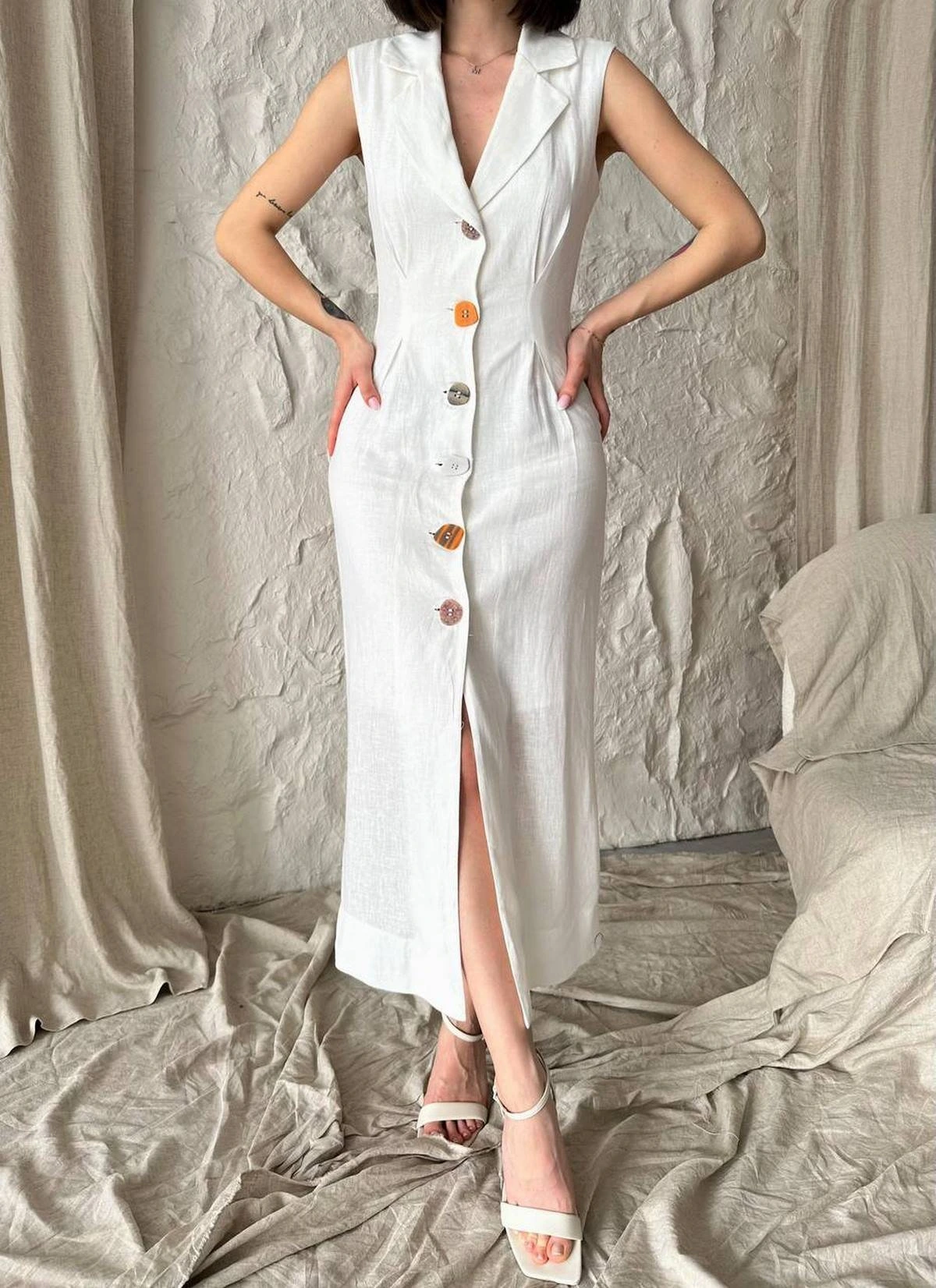 KEMİK DÜĞME ASTARLI PAMUK KETEN ELBİSE – EKRU