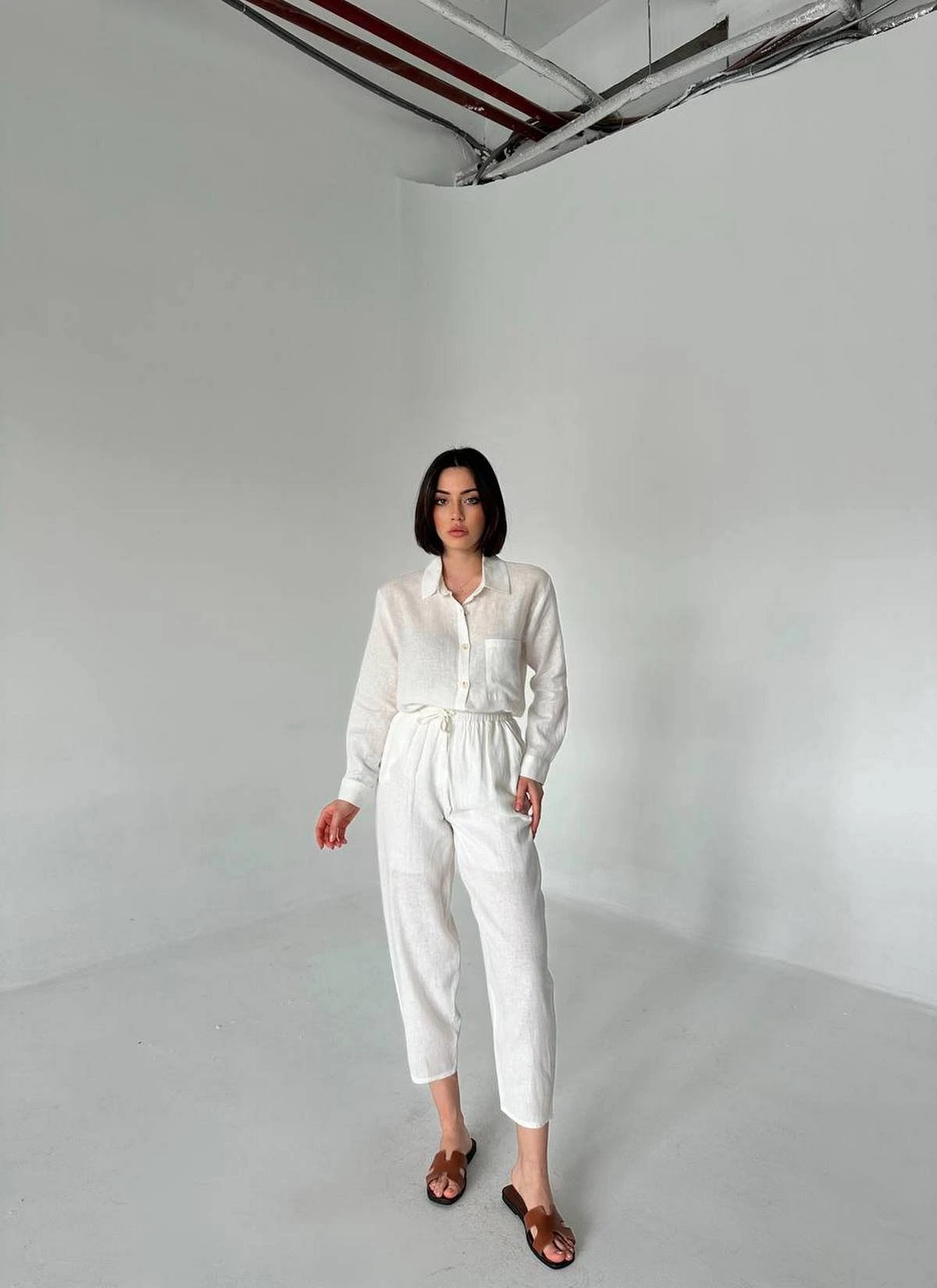 TEK CEP GÖMLEK BALON MODEL PANTOLON PAMUK KETEN TAKIM – EKRU