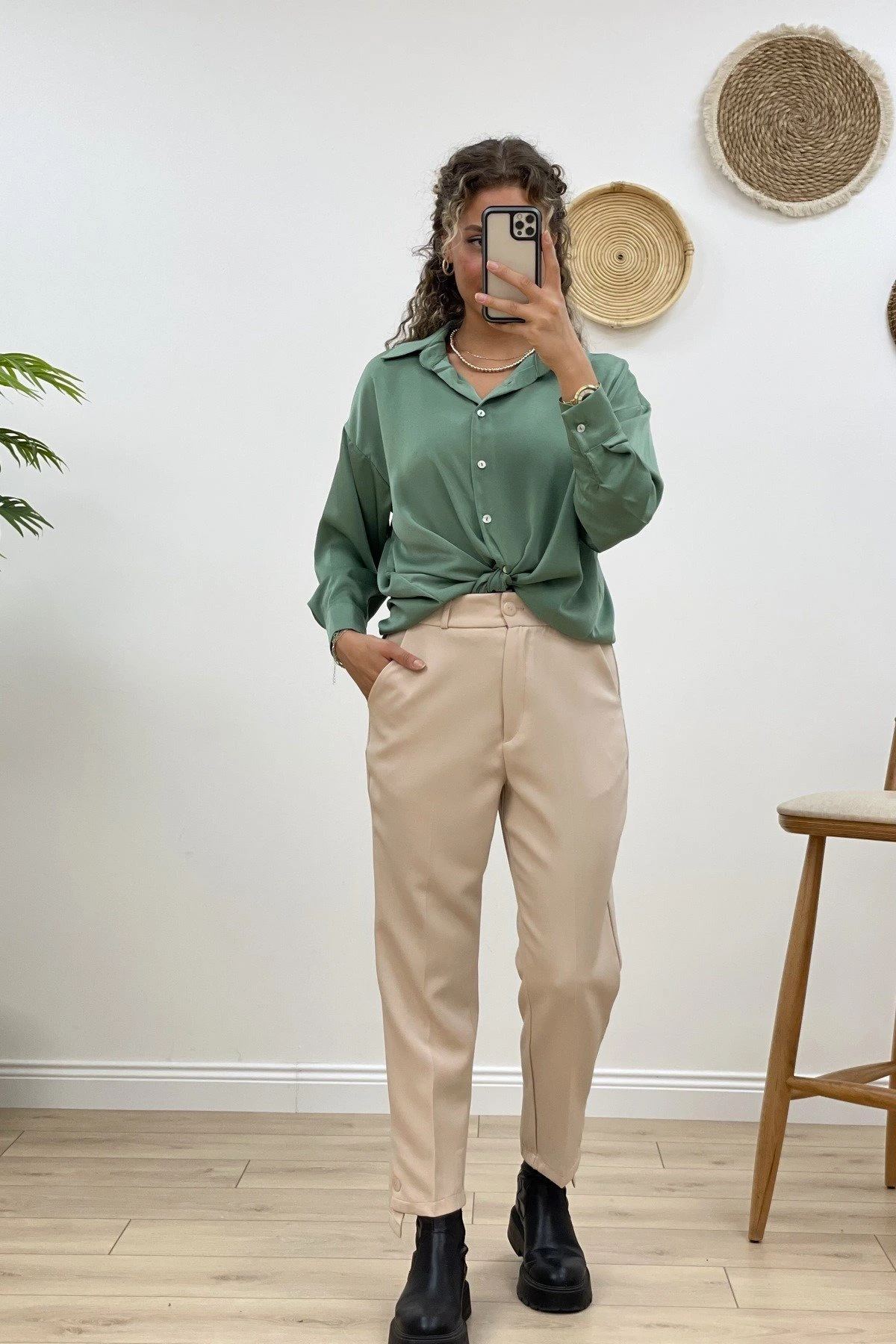 YAN FERMUARLI KESİK PAÇA DERİ PANTOLON – TAŞ