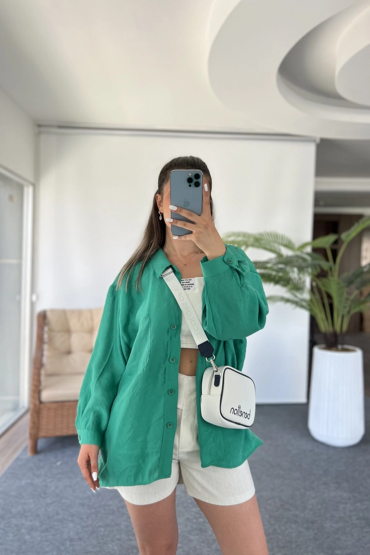 ARKA A PİLE DÜŞÜK OMUZ TEK CEP MODAL GÖMLEK – YEŞİL