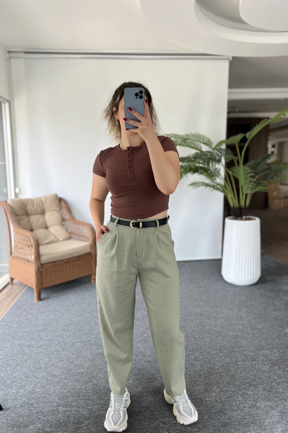 KEMERLİ PAMUK KETEN CEPLİ BOL PANTOLON – HAKİ