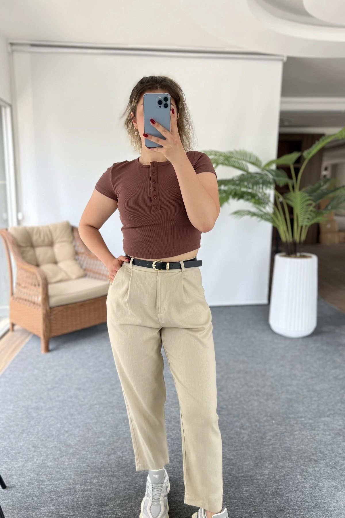 ARKA KAPAK CEP KEMERLİ HAVUÇ KETEN PANTOLON – TAŞ