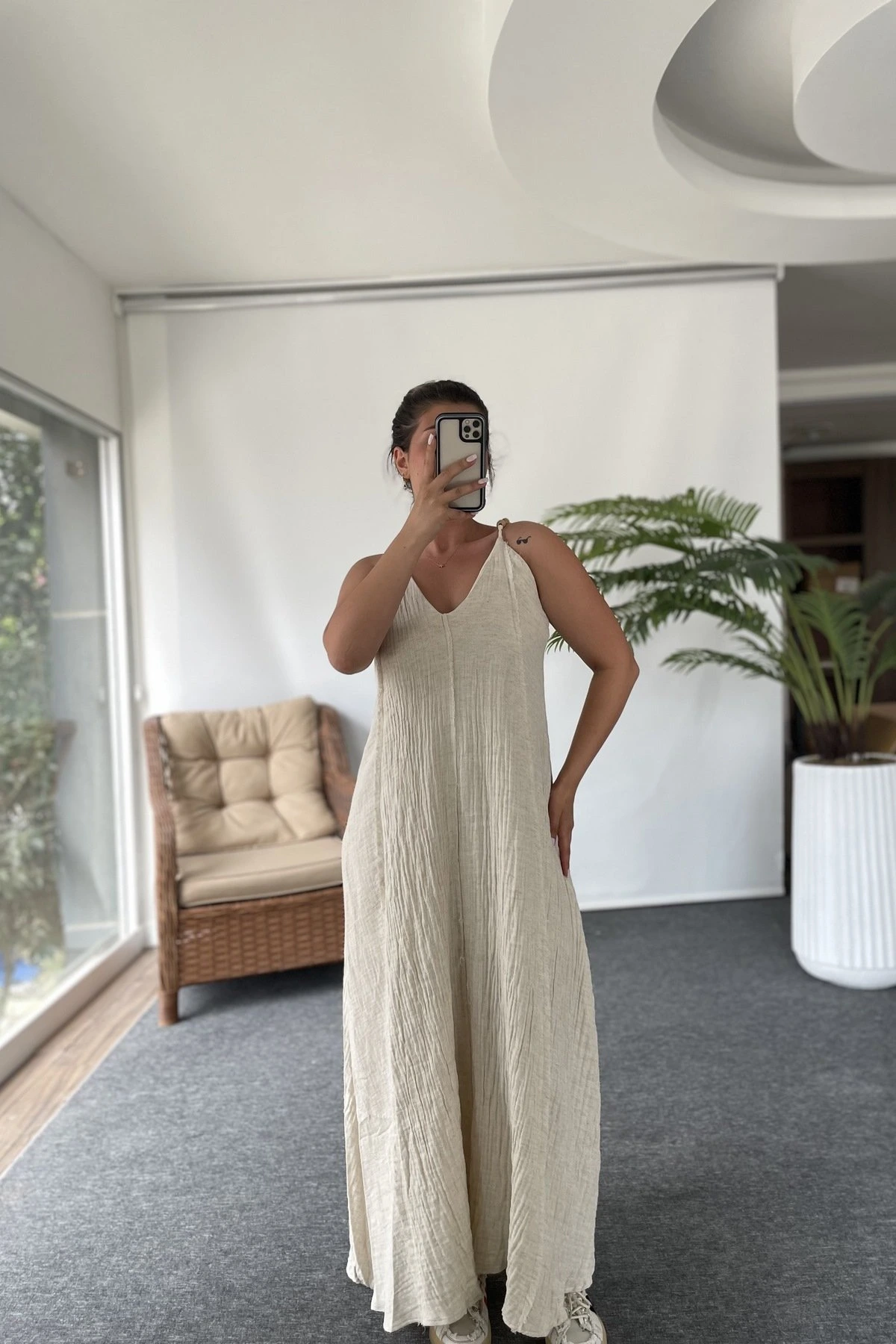 ASKI AHŞAP BONCUK ASTARLI PAMUK KETEN ELBİSE – TAŞ
