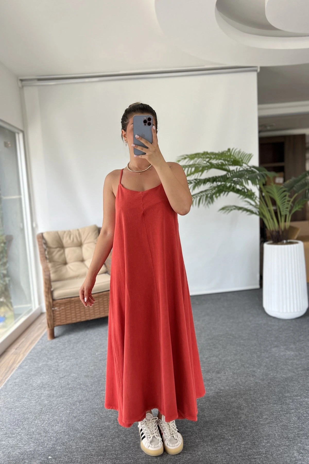 ASKI AYARLAMALI PAMUK LİKRA YIKAMALI SALAŞ ELBİSE – NAR ÇİÇEĞİ