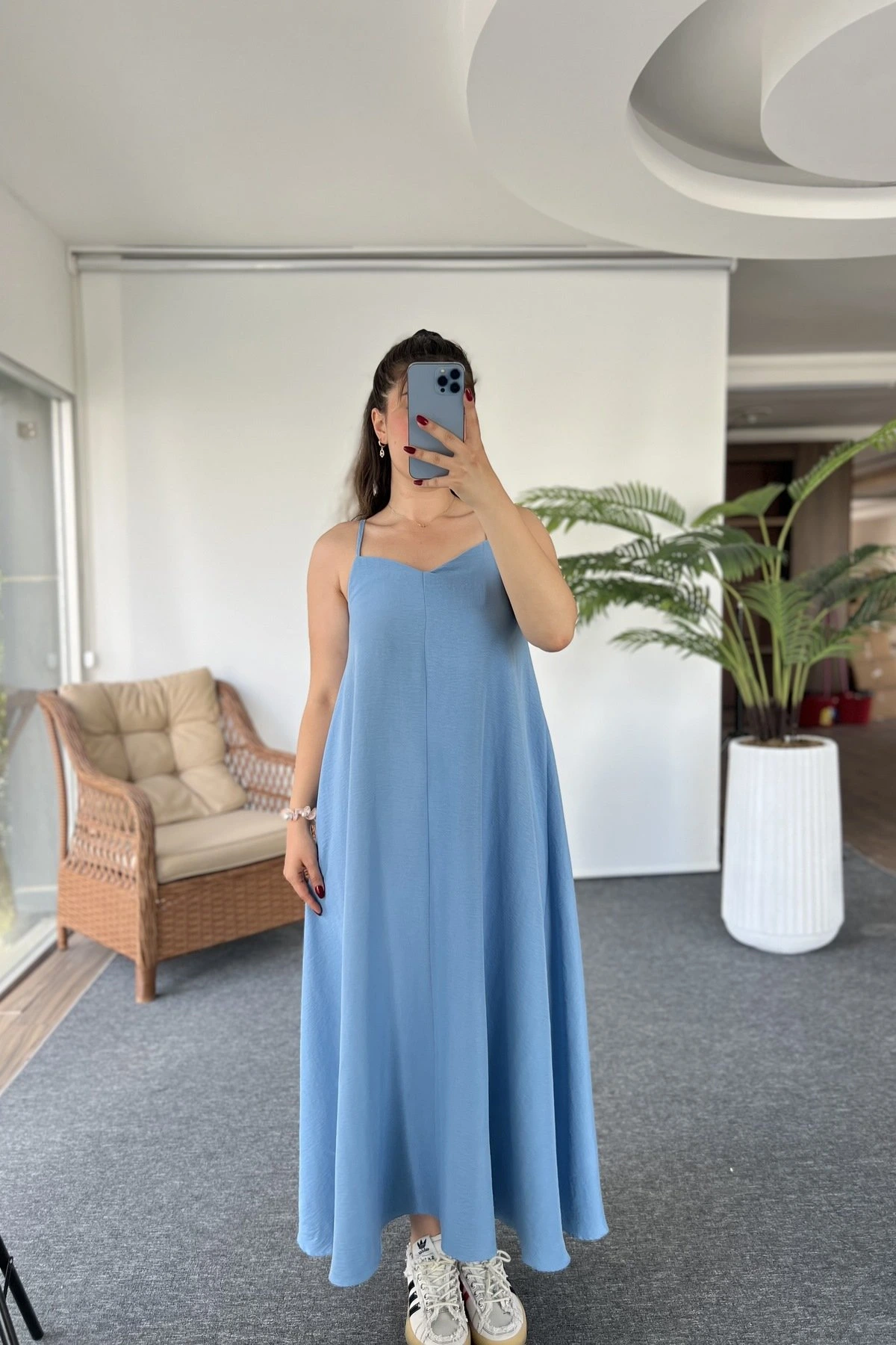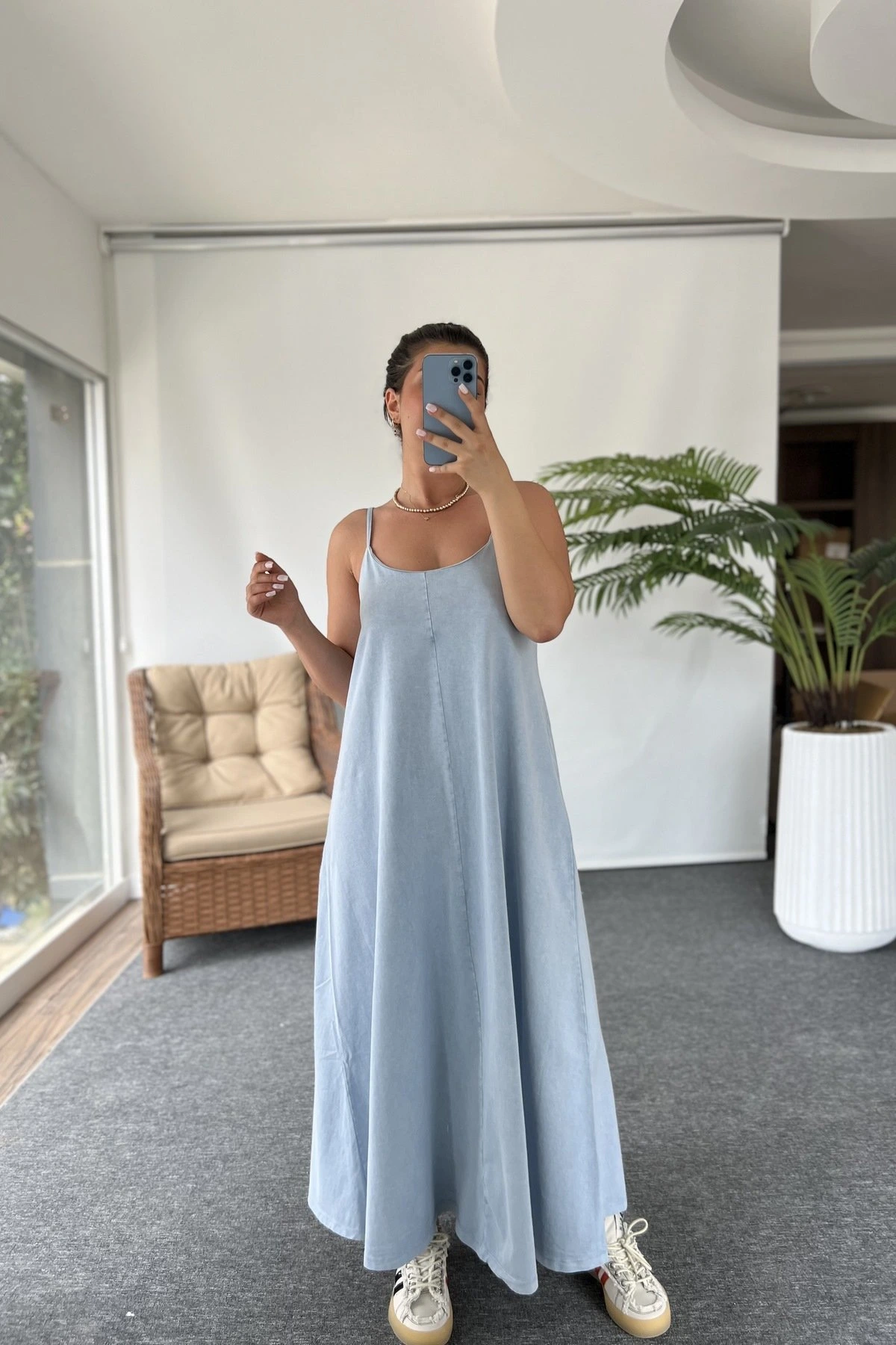 ASKI AYARLAMALI PAMUK LİKRA YIKAMALI SALAŞ ELBİSE – MAVİ