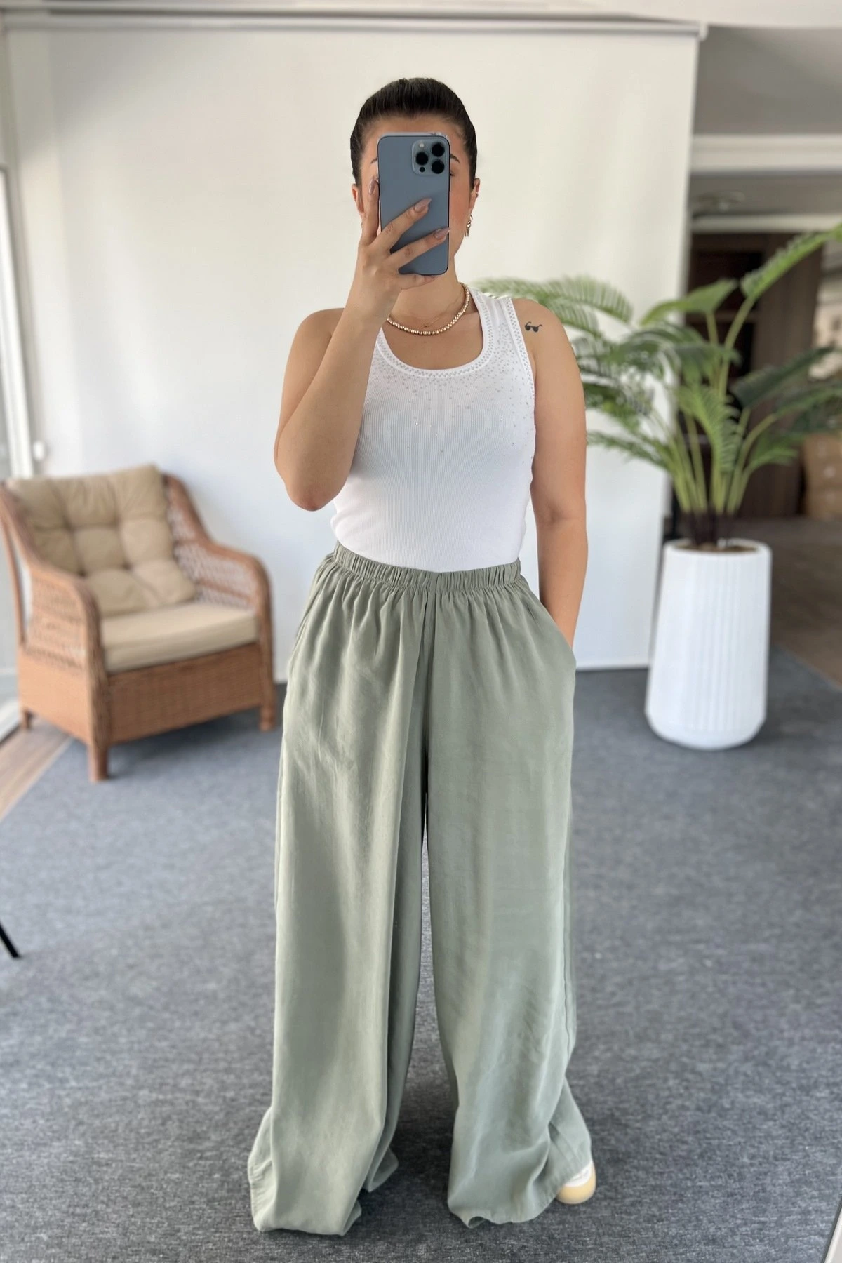 BEL LASTİK GENİŞ PAÇA CEPLİ MODAL PANTOLON – ÇAĞLA YEŞİLİ