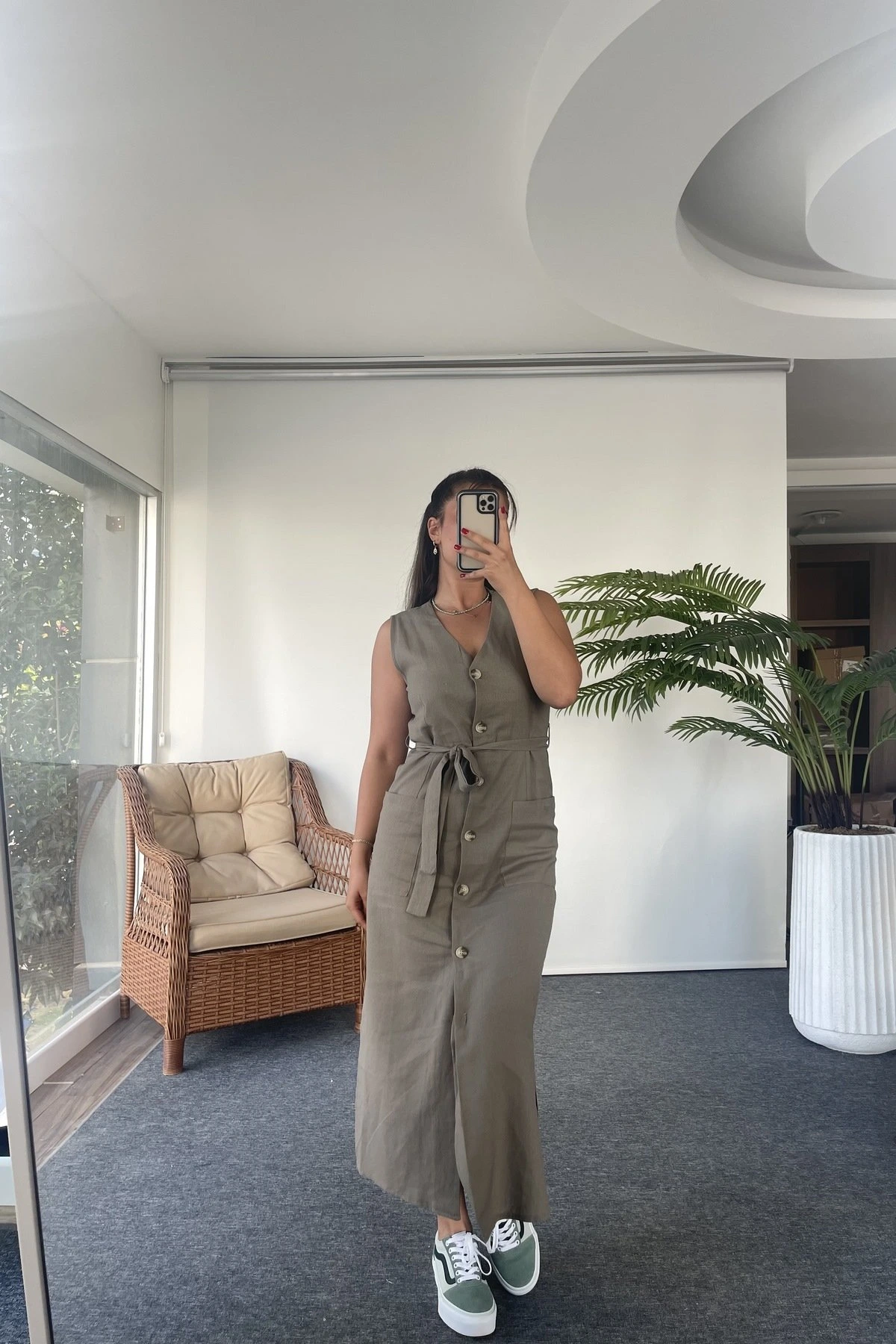 DÜĞMELİ CEPLİ YAN YIRTMAÇ KETEN VİSKON ELBİSE – VİZON