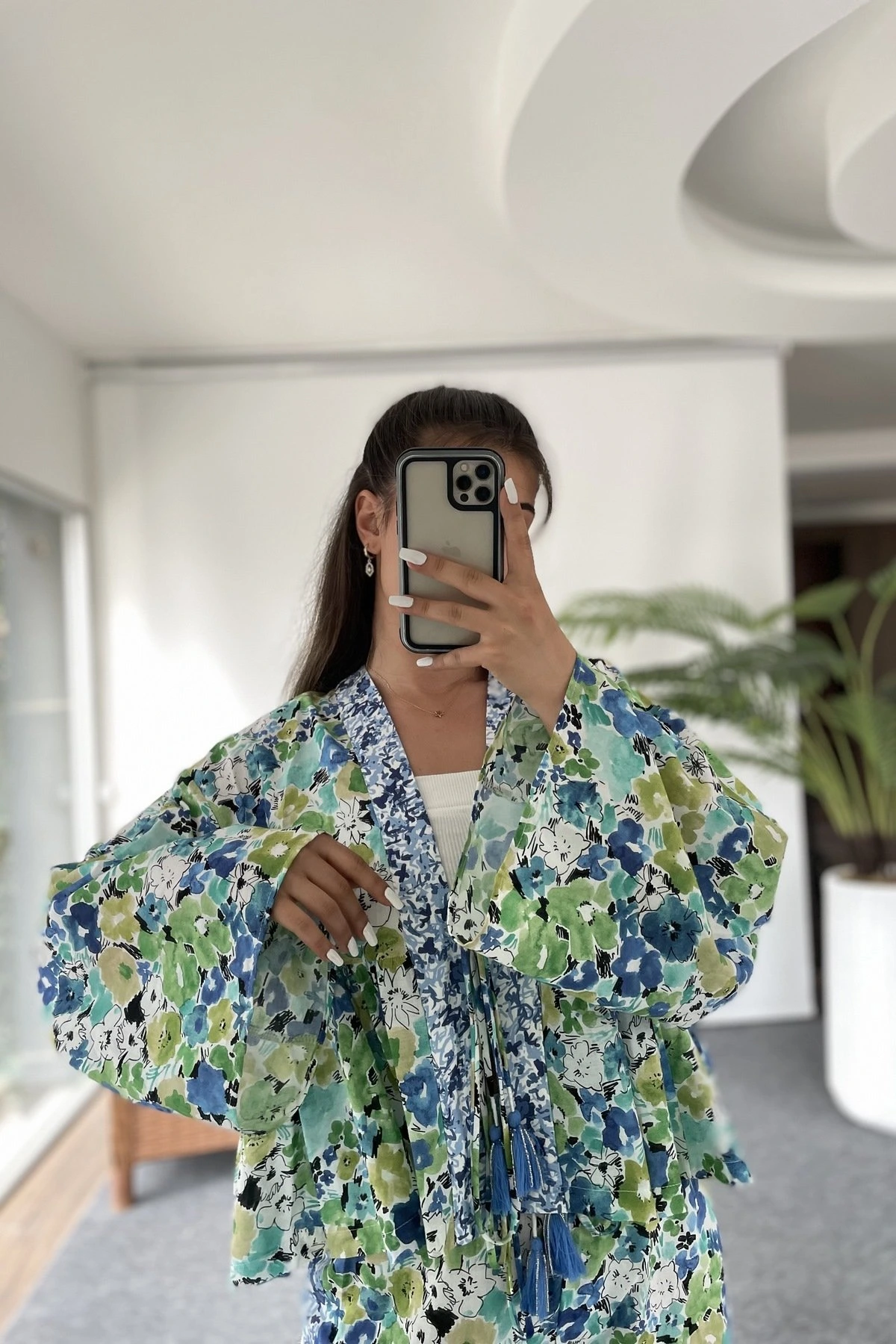 ETEĞİ PİLE PÜSKÜL BAĞCIK PAMUK RENKLİ KİMONO – YEŞİL