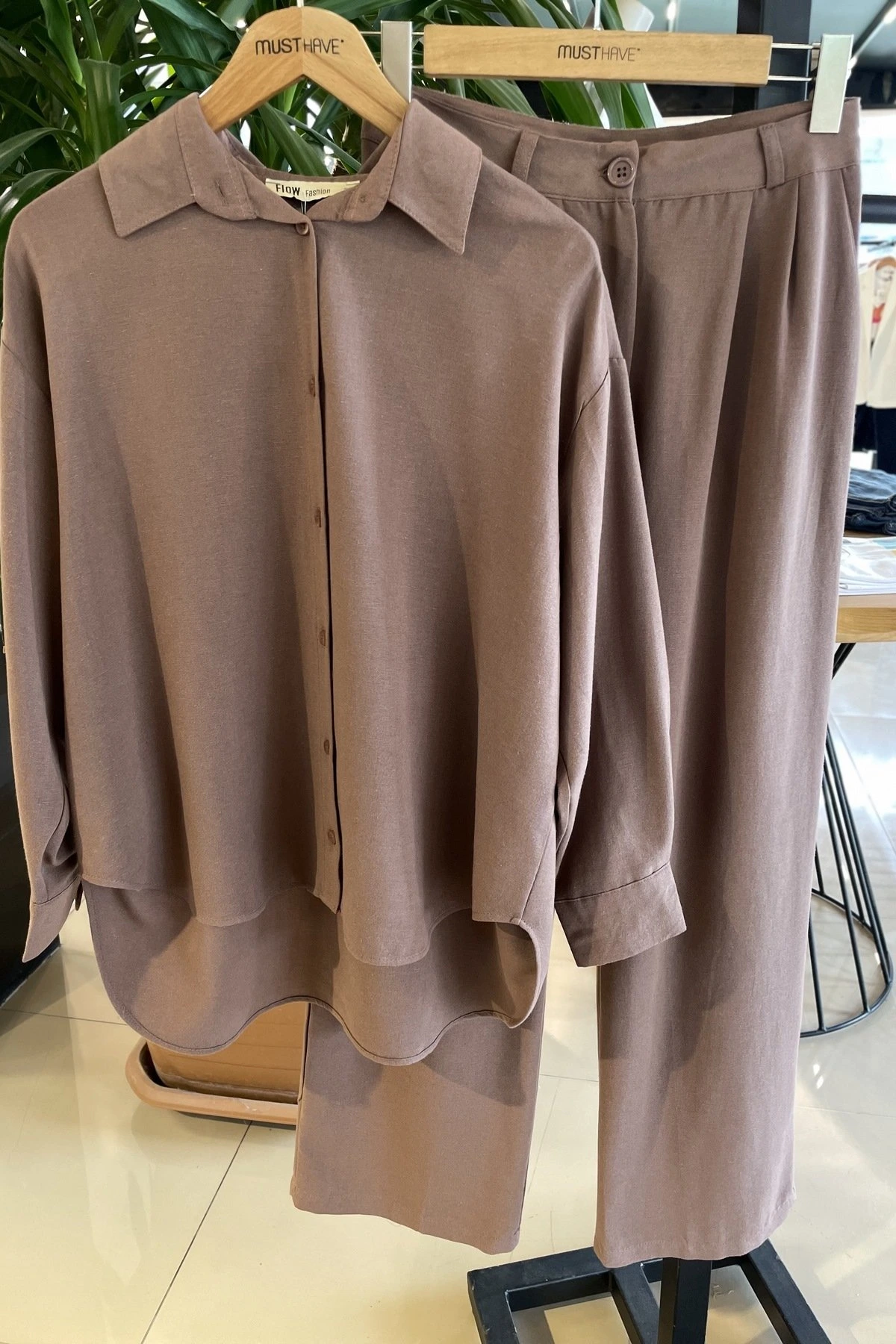 GÖMLEK PANTOLON PAMUK KETEN TAKIM – KAHVE