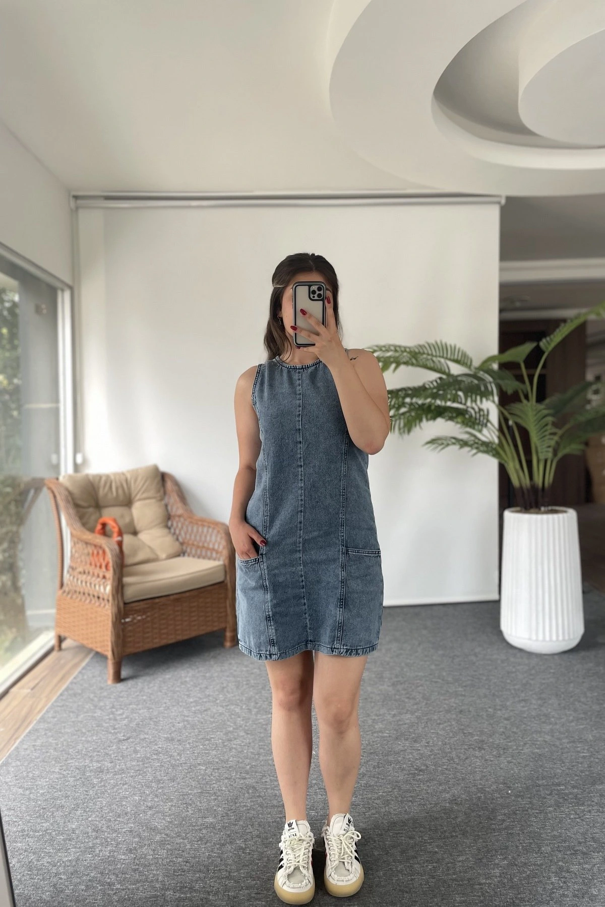 ÖN DİKİŞ CEP DETAY KISA JEAN ELBİSE – MAVİ