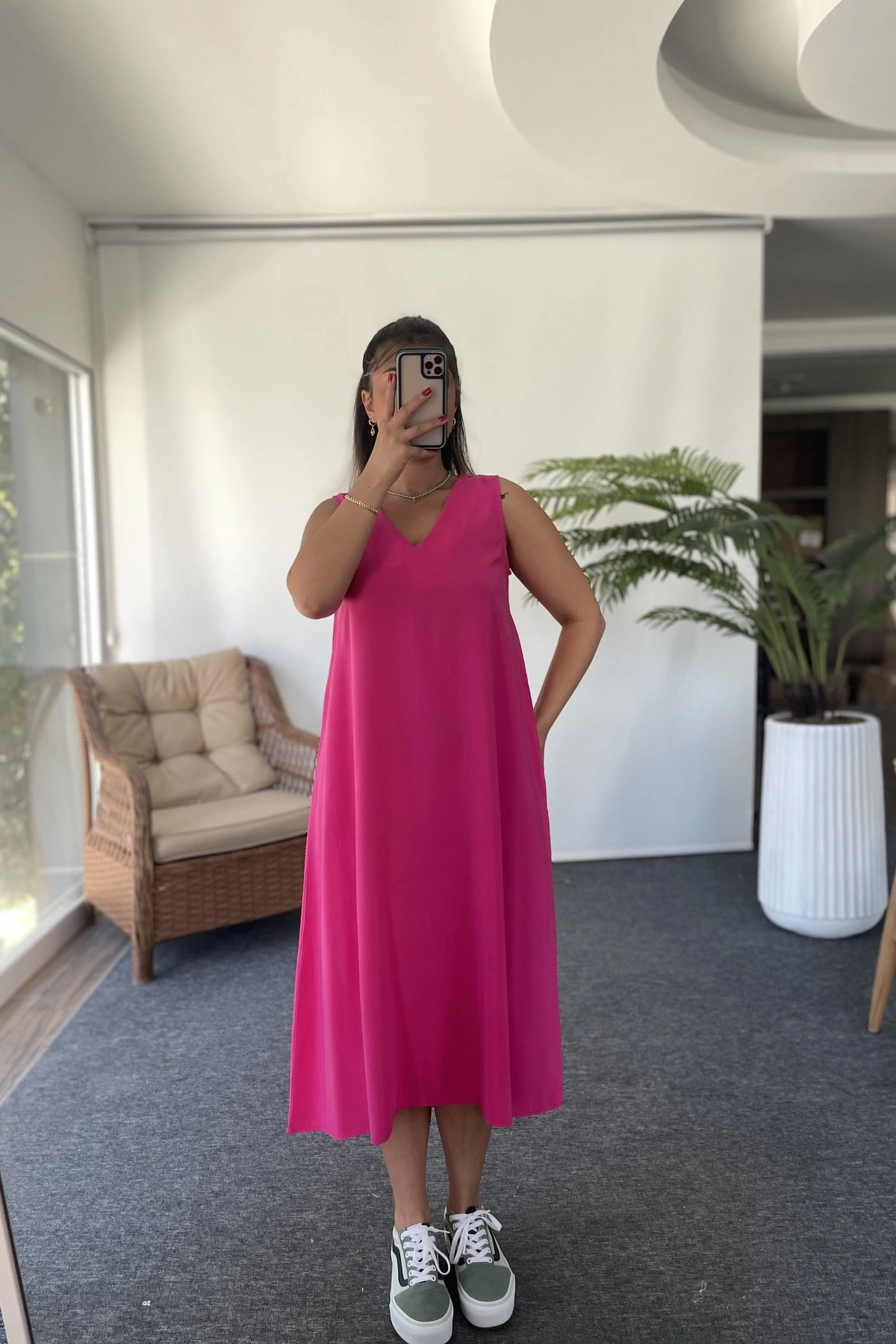 V YAKA JAPONE KOL RAHAT MİDİ ELBİSE – FUŞYA