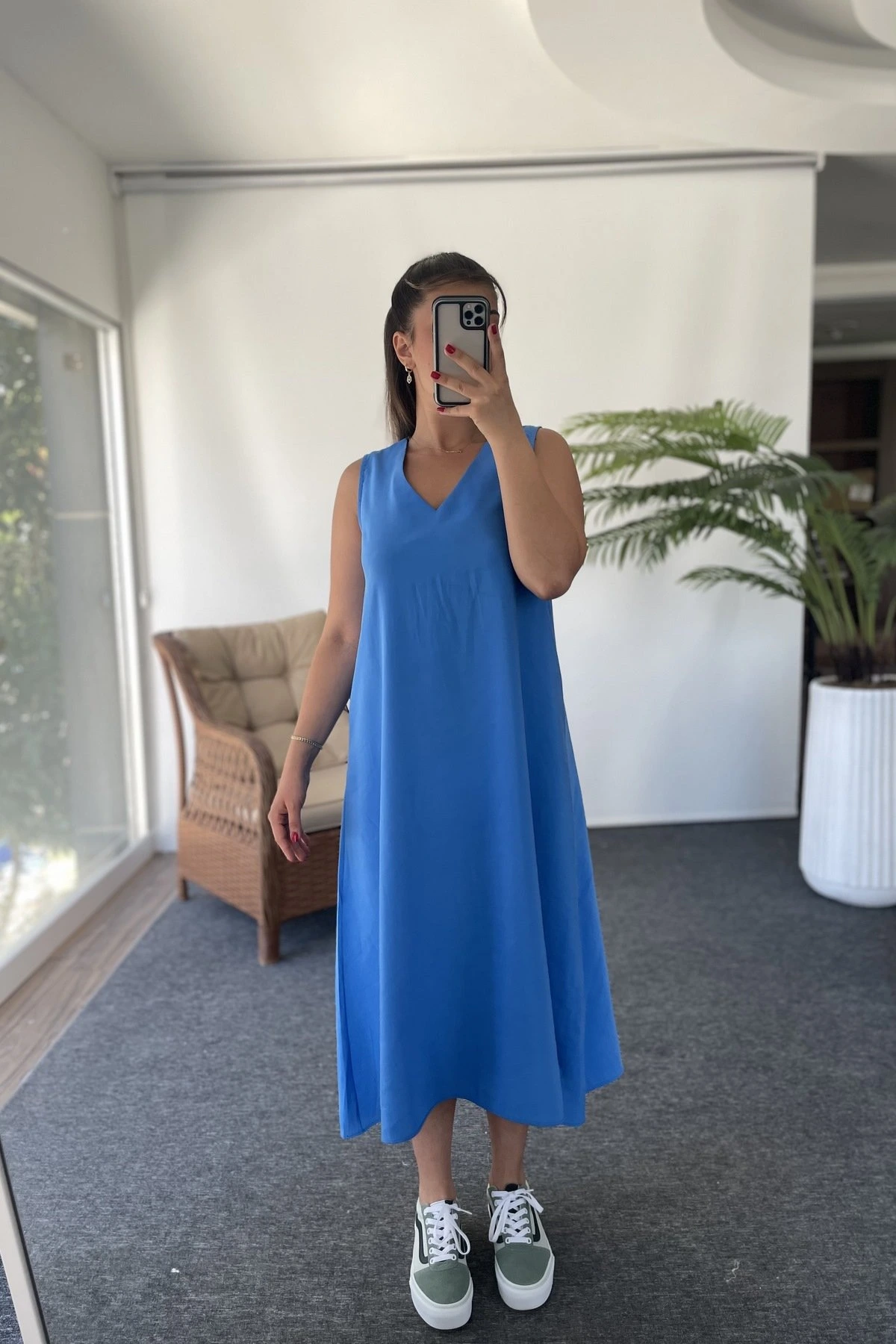 V YAKA JAPONE KOL RAHAT MİDİ ELBİSE – SAKS