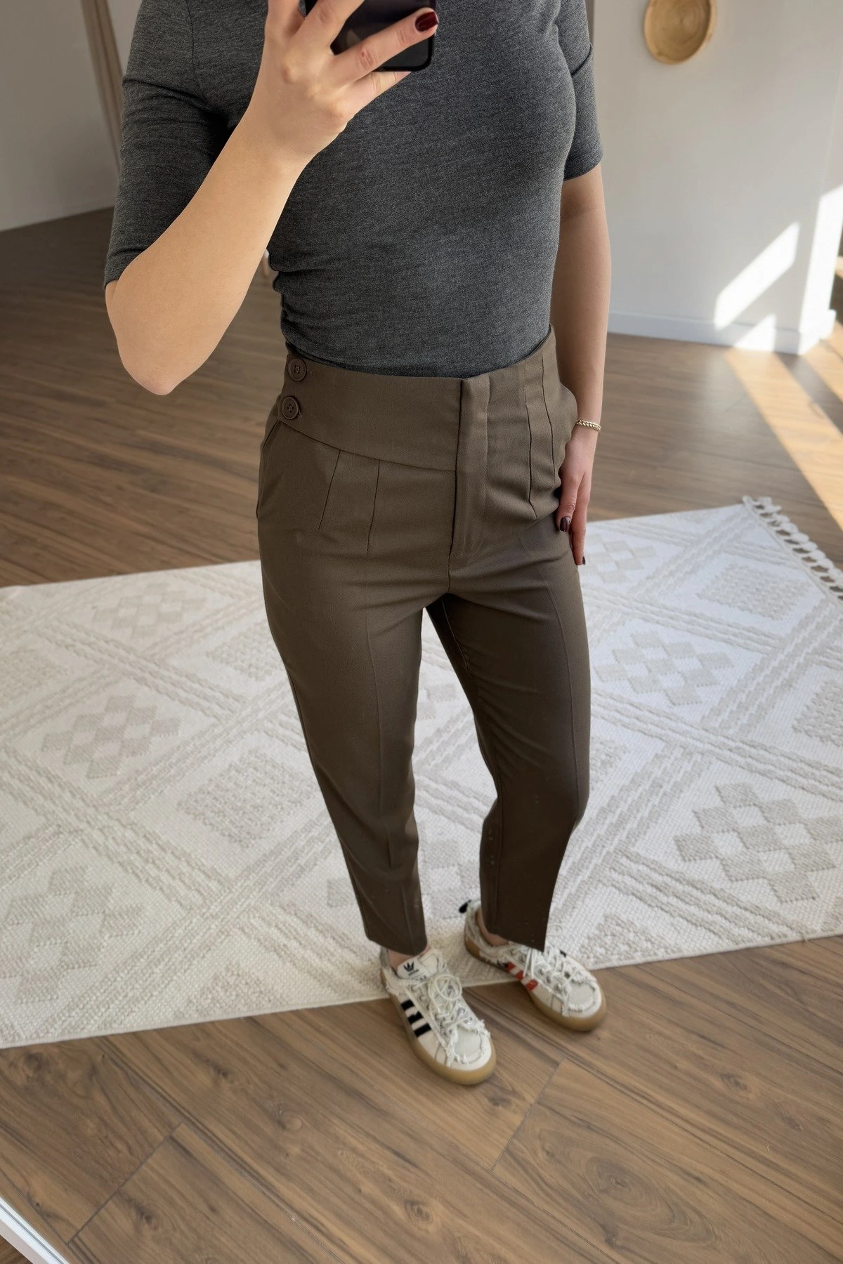 ARKA BEL V YAN DÜĞME DETAY VİSKON HAVUÇ PANTOLON – KAHVE