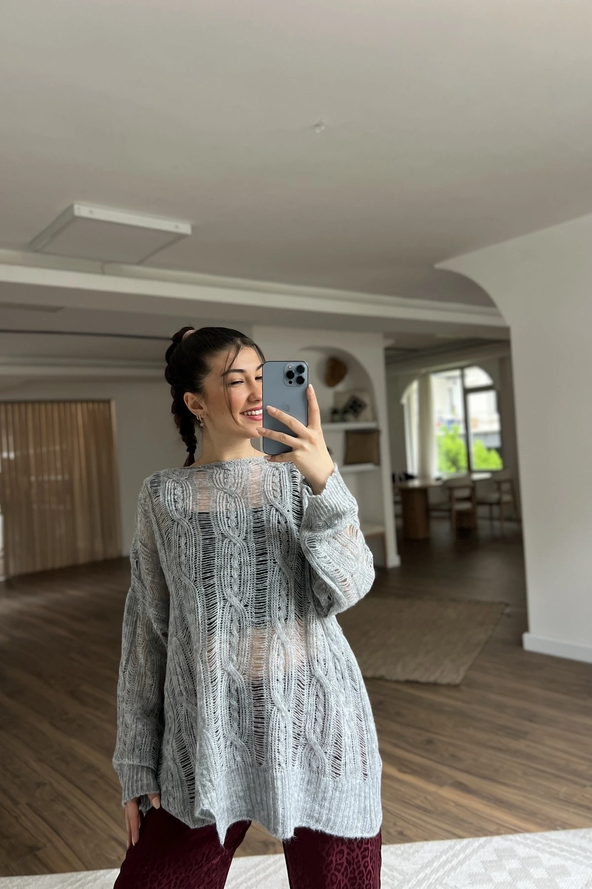 ETEĞİ ASİMETRİ SAÇ ÖRGÜ AJURLU KAZAK – GRİ