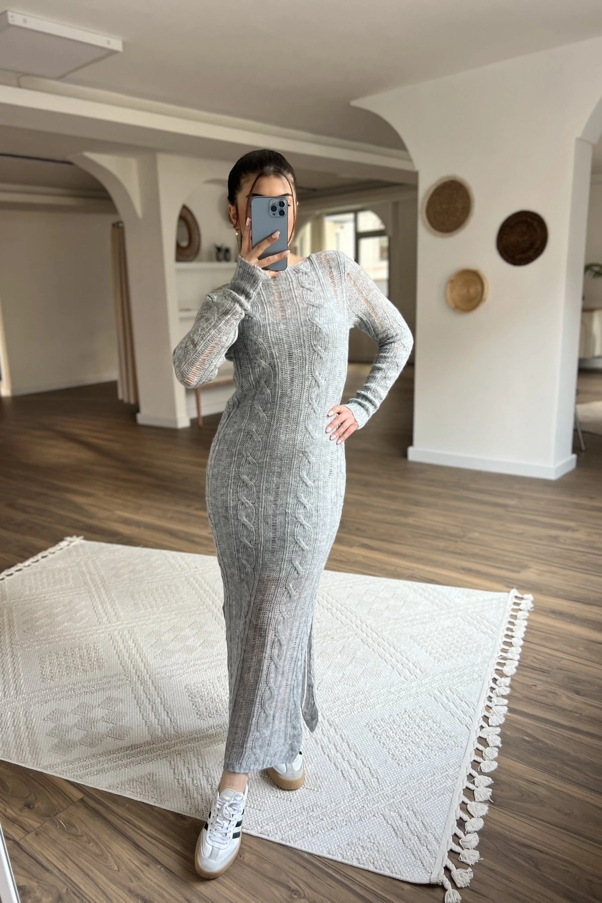 SAÇ ÖRGÜ ASARLI YAN YIRTMAÇ AJURLU UZUN TRİKO ELBİSE – GRİ