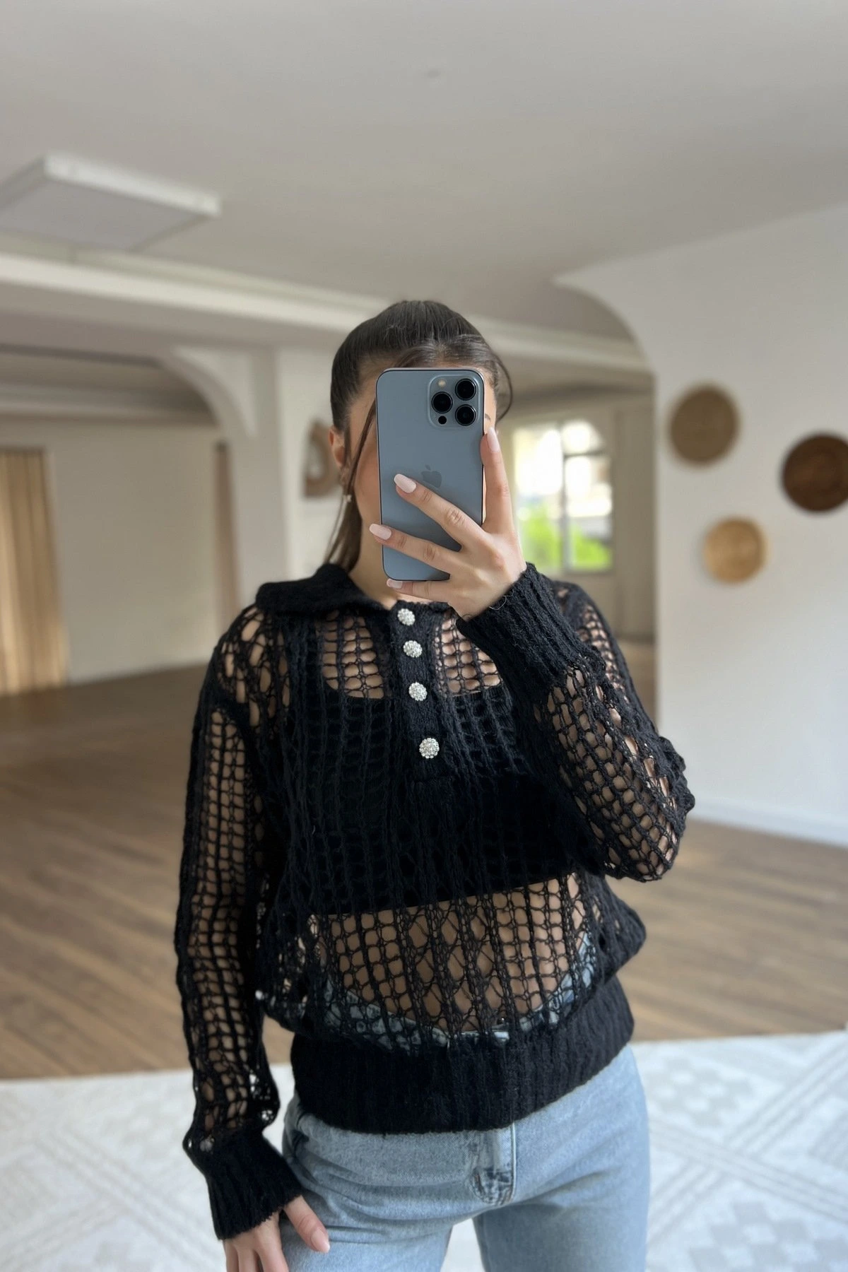 YAKALI TAŞ DÜĞME AJURLU YÜN KARIŞIM TRİKO – SİYAH