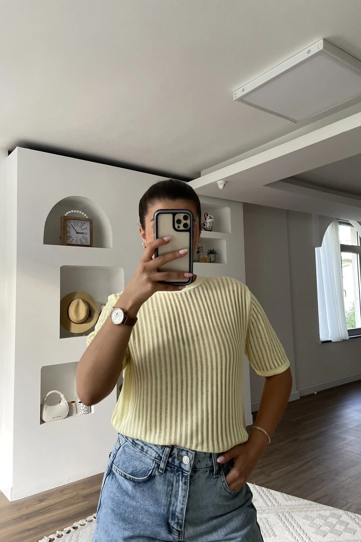BİSİKLET YAKA AJURLU VİSKON BLUZ – SARI