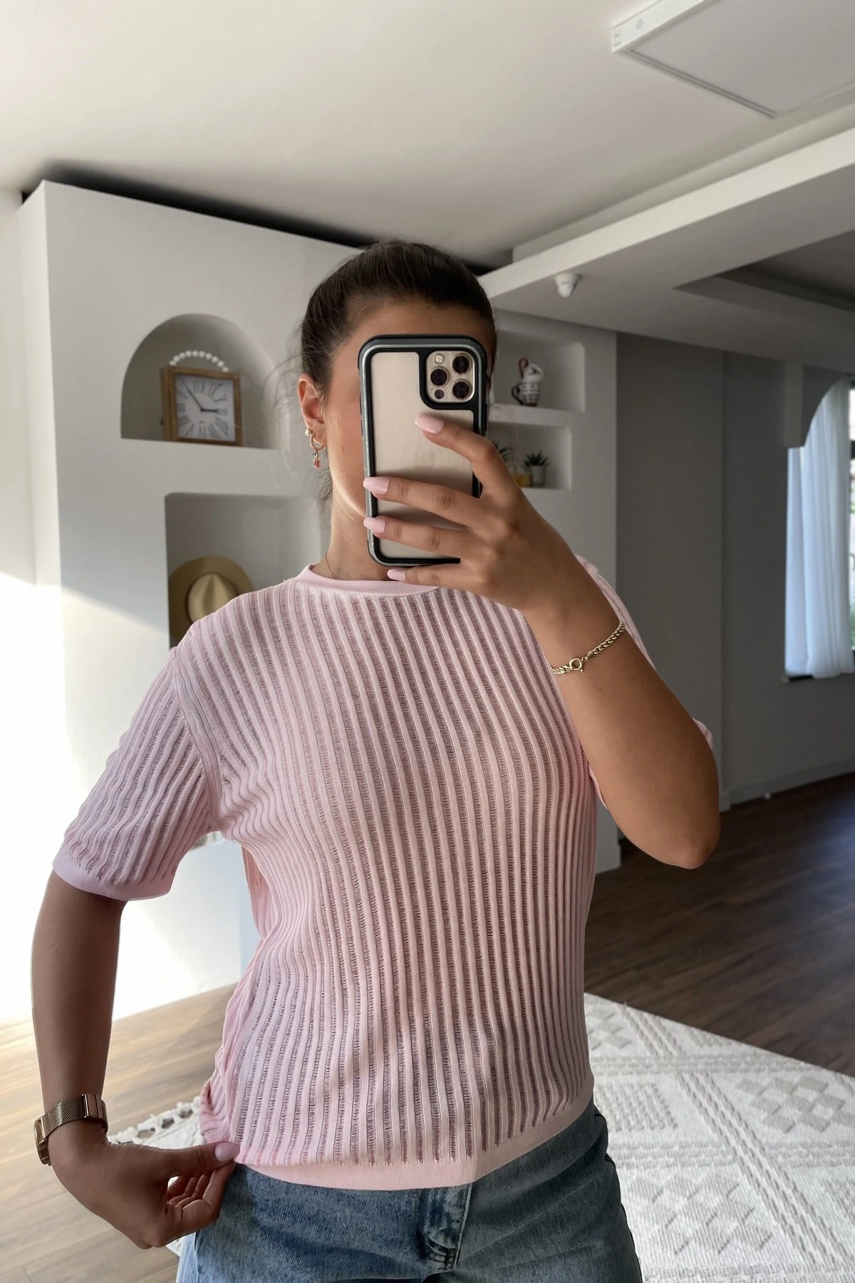 BİSİKLET YAKA AJURLU VİSKON BLUZ – PEMBE