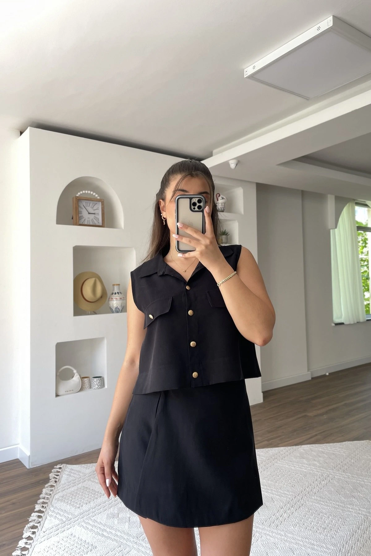KAPAK CEP DETAY GOLD DÜĞME ŞORT ETEK PAMUK TAKIM – SİYAH