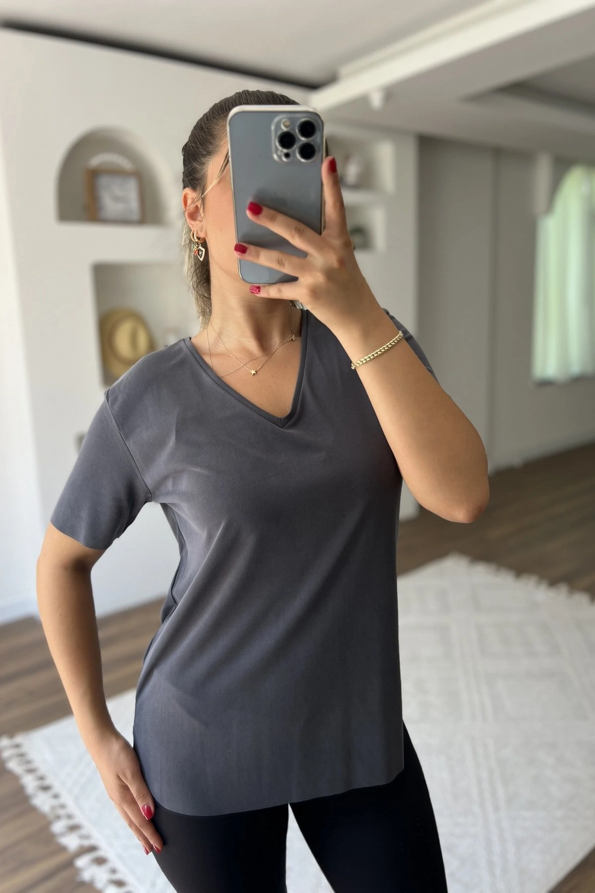 V YAKA LAZER KESİM LİKRALI MODAL TİŞÖRT – ANTRASİT