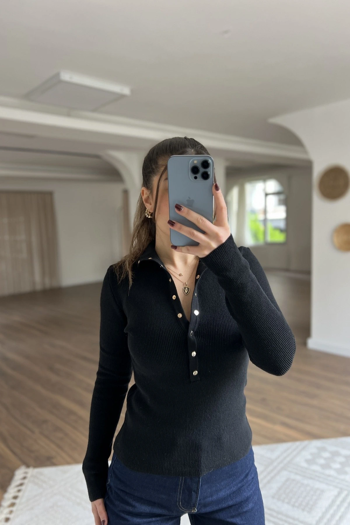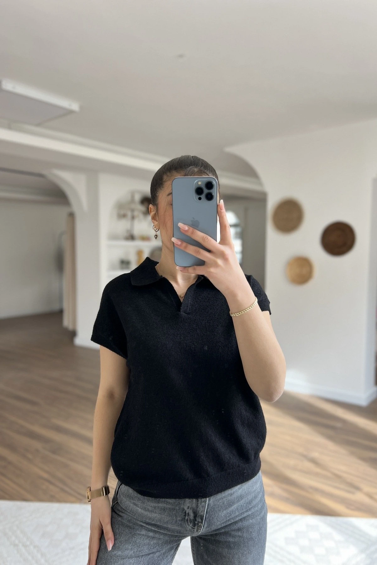 YAKA VE ETEĞİ PARÇALI PAMUK İNCE BLUZ – SİYAH