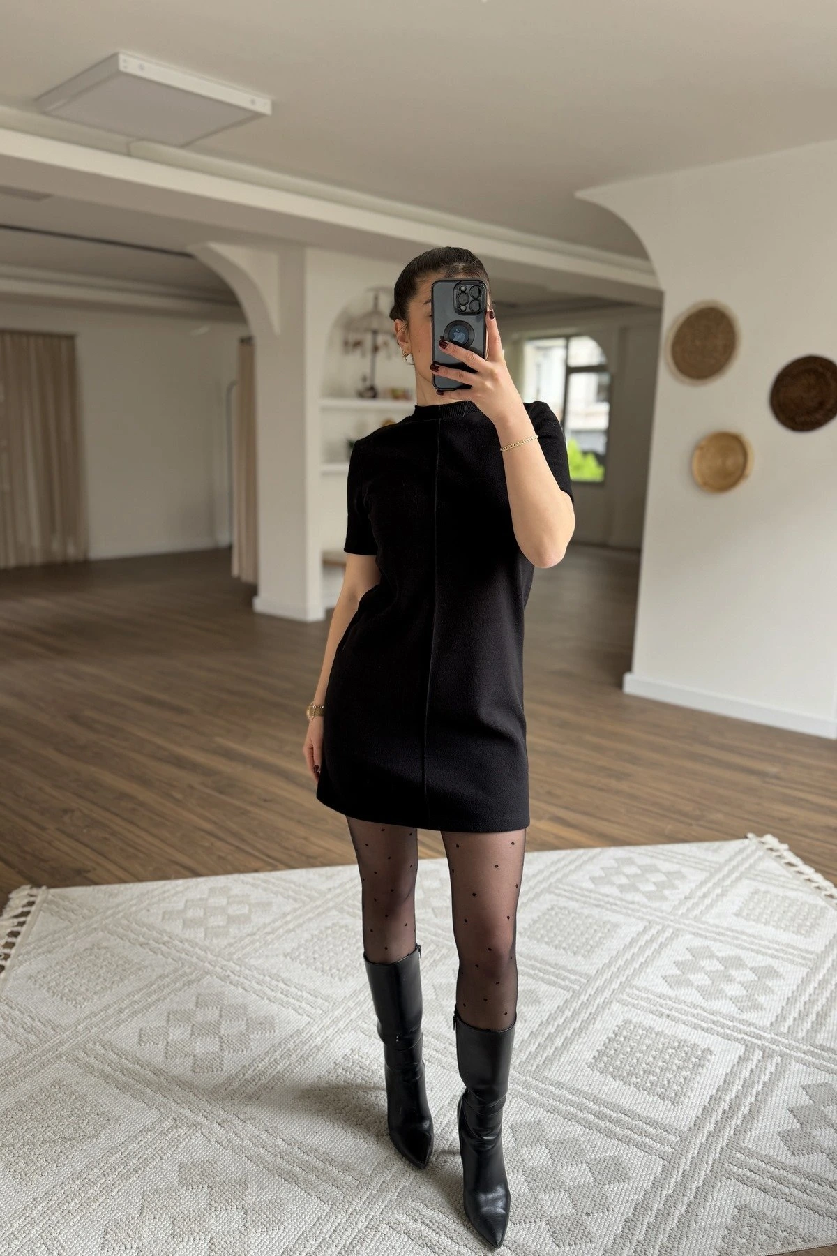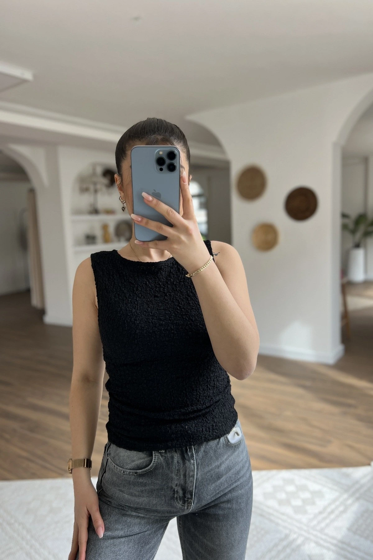 BİSİKLET YAKA DANTEL FIRFIRLI VİSKON İNCE TRİKO – SİYAH