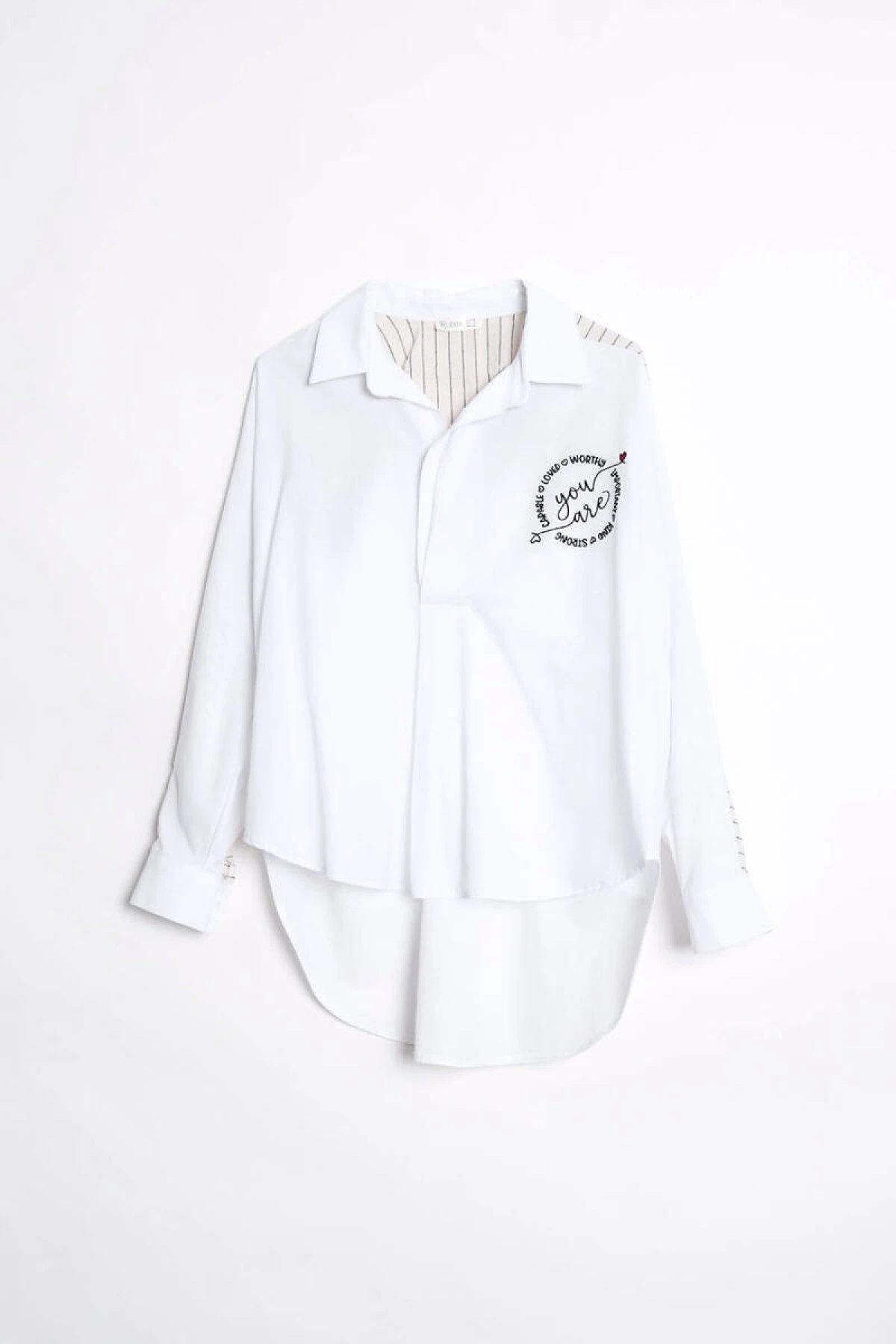 OMUZ ÇİZGİLİ YOU ARE YAZI NAKIŞ ARKA UZUN GÖMLEK – BEYAZ-SİYAH