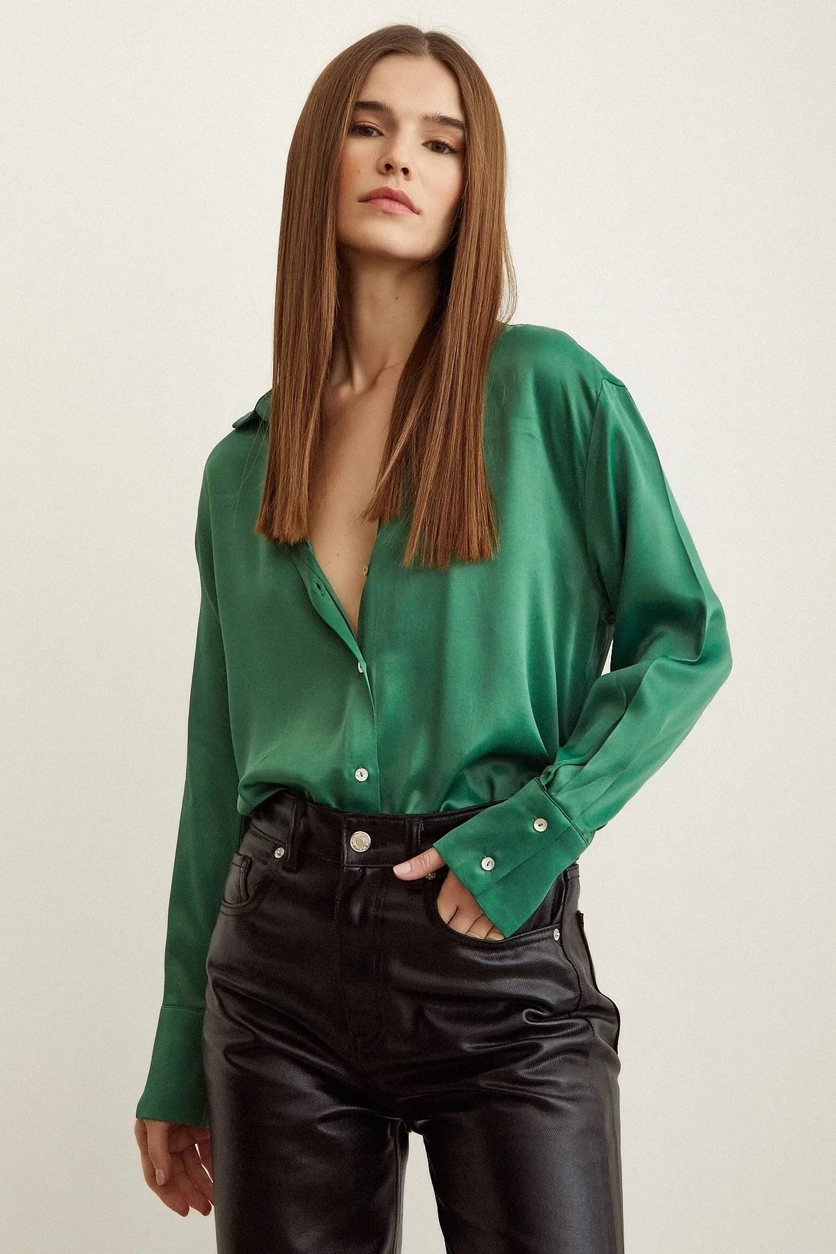V YAKA KALIN PARLAK SATEN GÖMLEK – BENETTON YEŞİLİ