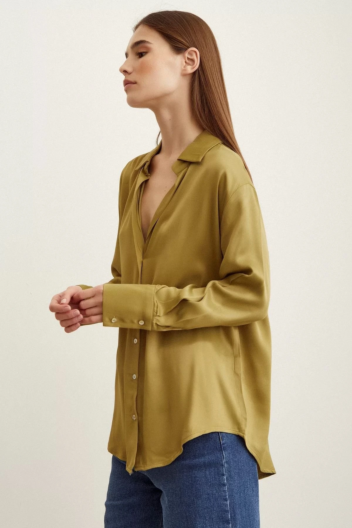 V YAKA KALIN PARLAK SATEN GÖMLEK – YAĞ YEŞİL
